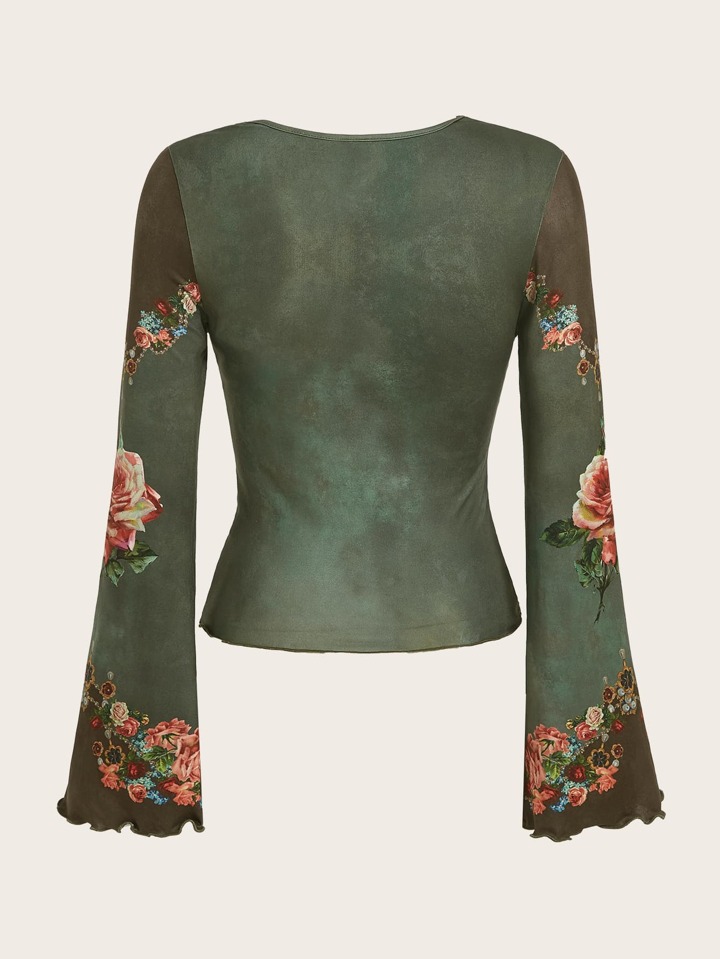 Grunge Floral Print Contrast Lace Flounce Sleeve Tee