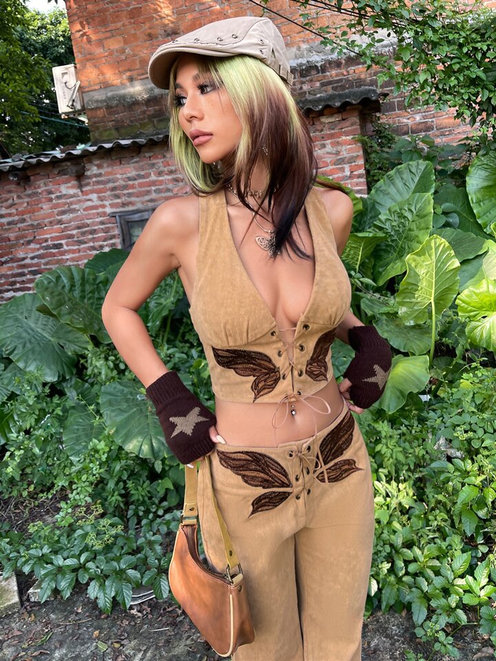 Grunge Lace Up Front Crop Cord Halter Top & Flare Leg Pants Set