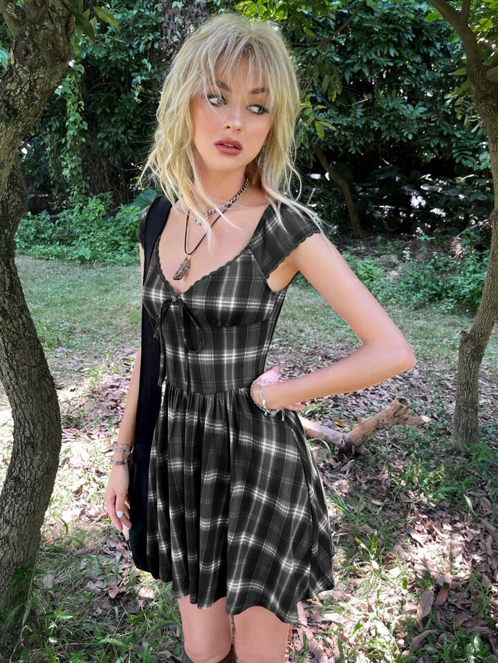 Grunge Plaid Print Knotted Front Lace Trim Dress