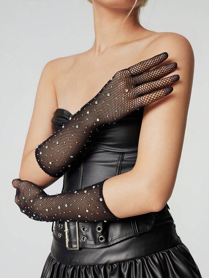 Grunge Punk 1 Pair Black Net Mesh Arm Sleeves, Y2K Rhinestone Embellished Arm Warmers, Suitable For Party/Stage Performance