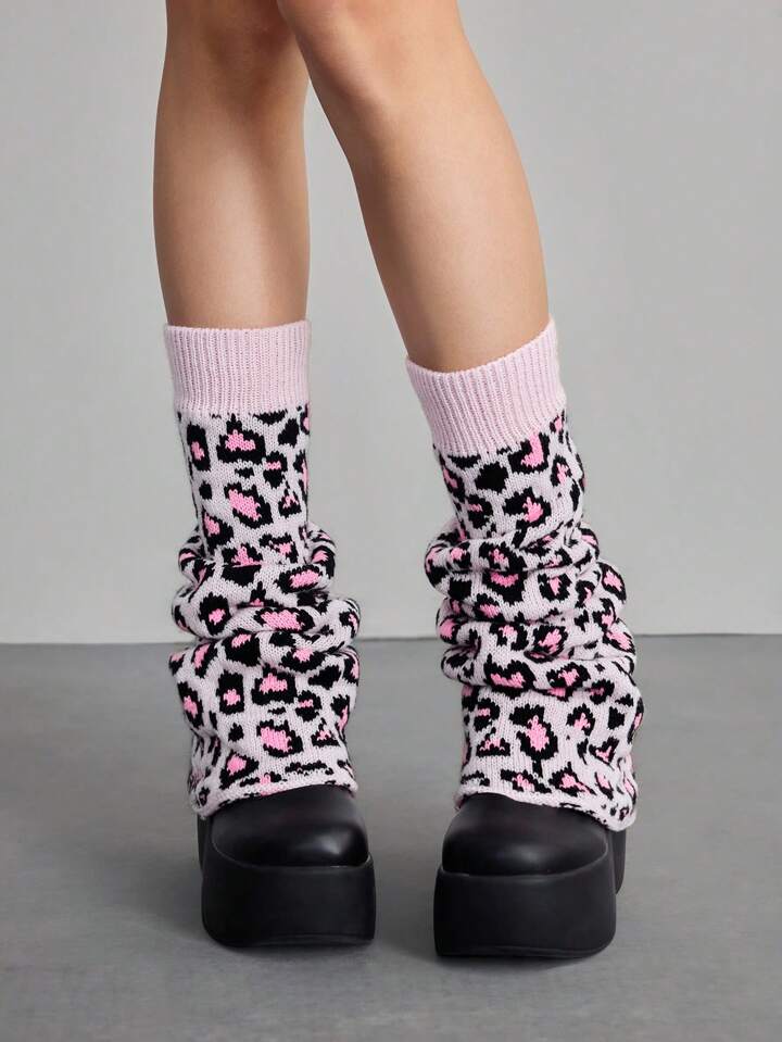 Grunge Punk 1 Pair Cute Kawaii Pink-Black Heart & Leopard Print White Leg Warmers