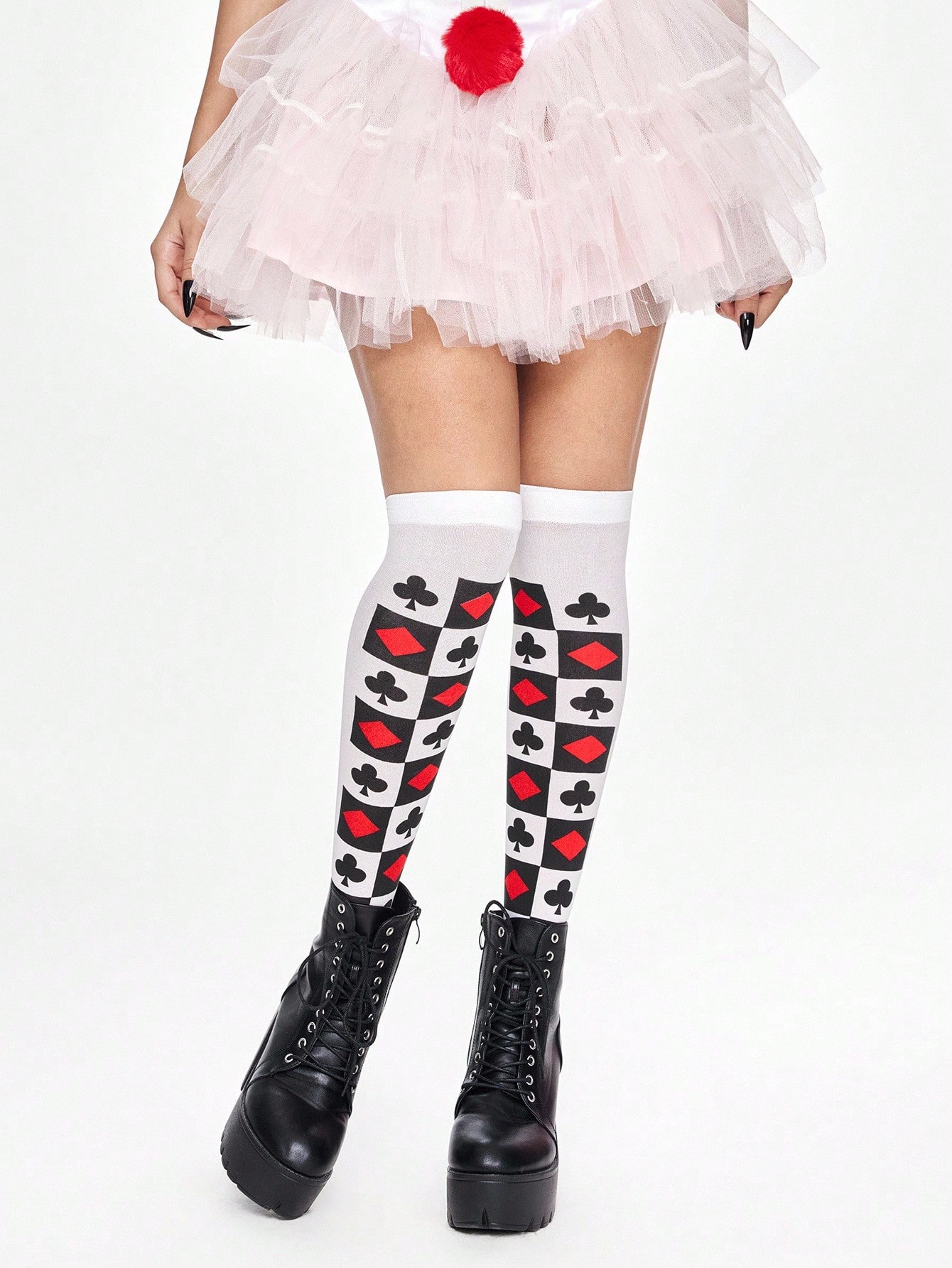 Grunge Punk 1 Pair Playing Card Pattern Over-The-Knee Socks, Y2K School Style Contrast Color Thigh High Socks, Halloween Ultra-Thin Elastic Sheer Tights