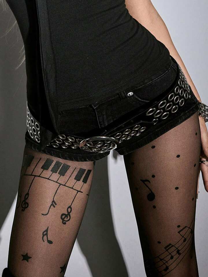 Grunge Punk 1 Pair Sexy Skeleton Print Tights, Y2K Minimalist Style Solid Black Pantyhose, Super Thin Elastic Sheer Leggings
