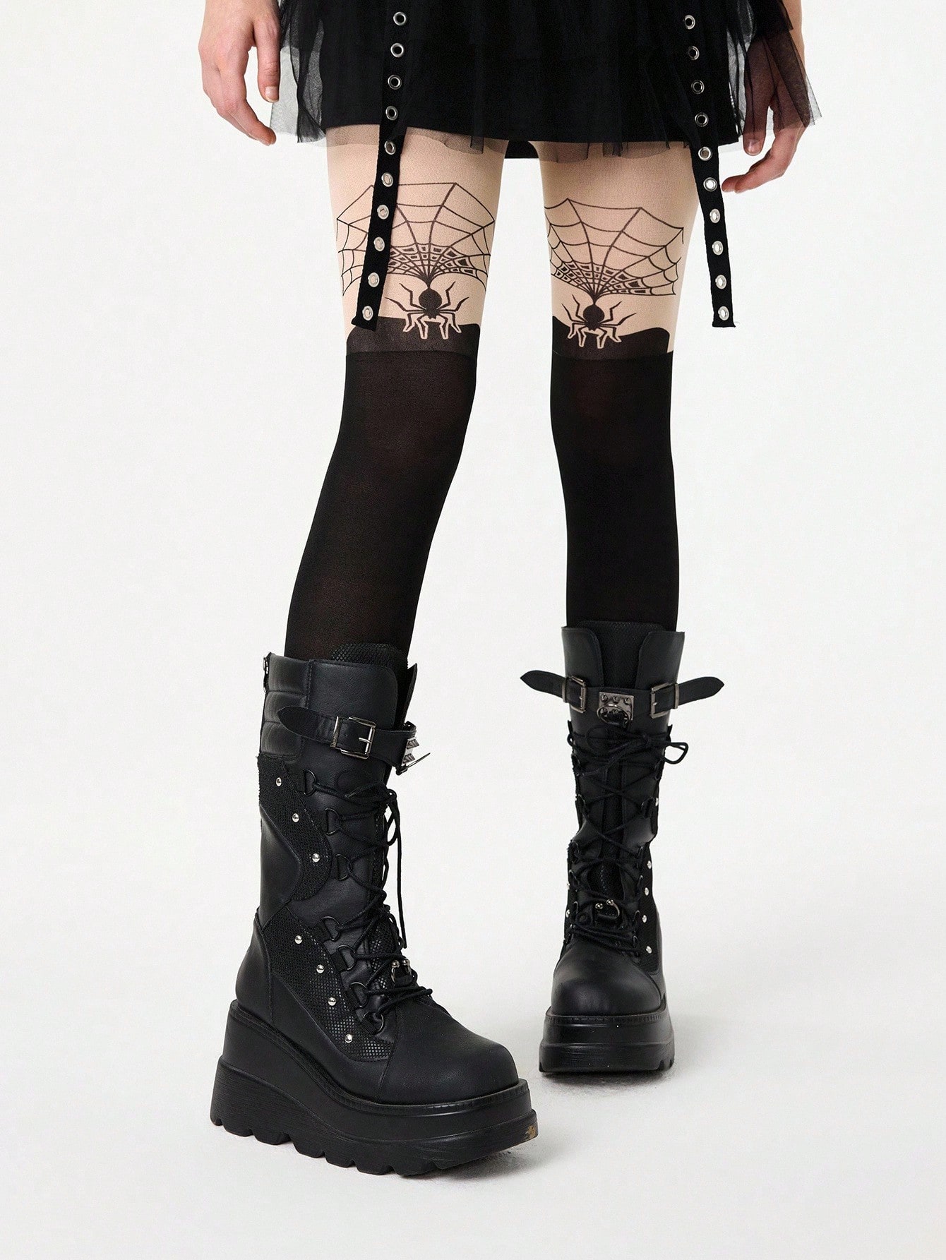 Grunge Punk 1 Pair Spider Web Patterned Tights, Y2K Minimalist Style Black & Skin Tone Patchwork Pantyhose, Ultra-Thin Elastic Sheer Leggings