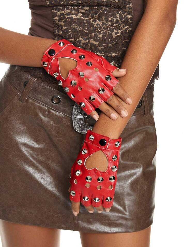 Grunge Punk 1 Pair Women Cute Basic Studded Heart-Shaped Fingerless Gloves, Suitable For Casual And Nightclub In Winter