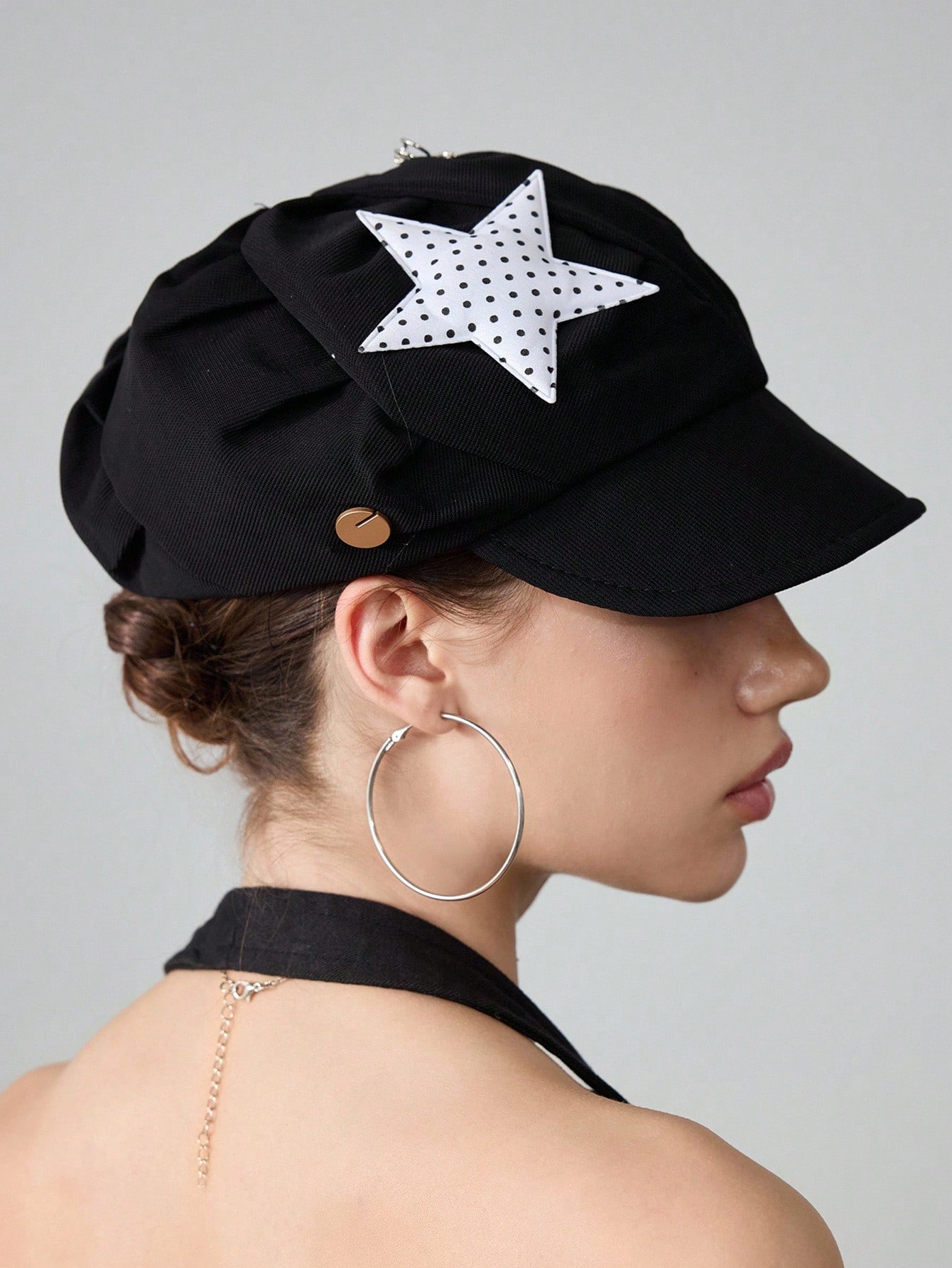 Grunge Punk 1pc Black Y2K Punk Retro Polka Dot Star Millennium Streetwear Vibe Metal Clip Chained Fashion Beret Hat For Women, Suitable For Casual, Travel And More