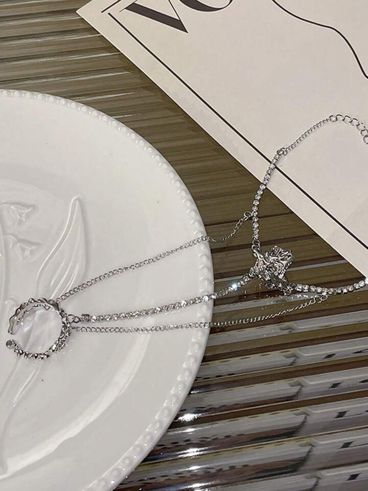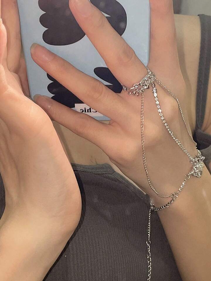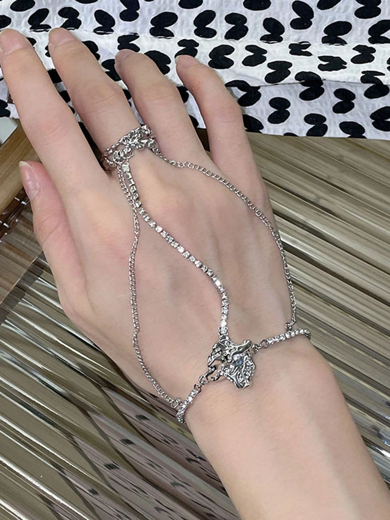 Grunge Punk 1pc Full Diamond Inlaid Chain With Ring Attached Bracelet