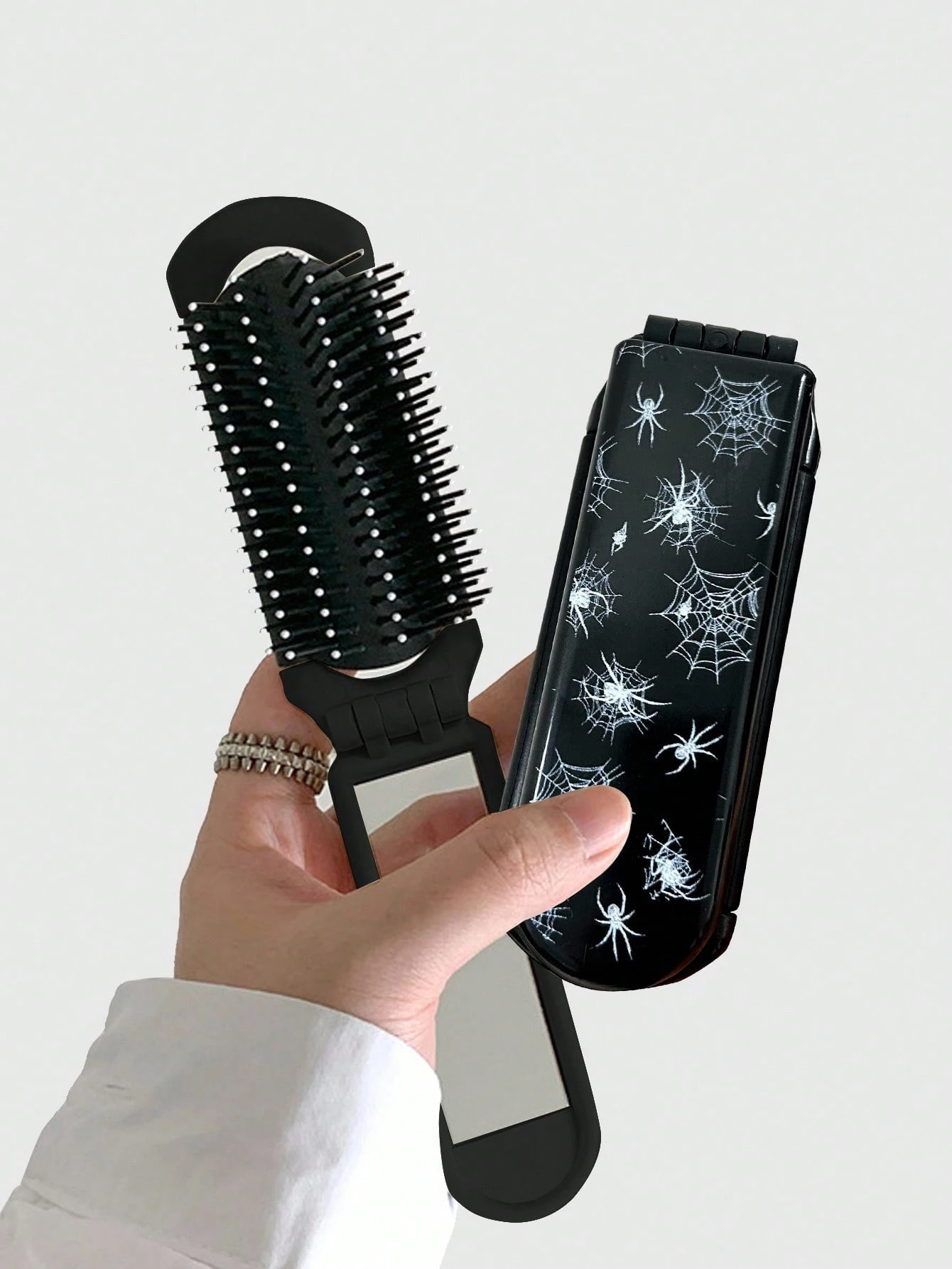 Grunge Punk 1pc Halloween Spider Web Pattern Folding Comb With Mirror, Portable Back To School Accessory (Pattern Placement Random)