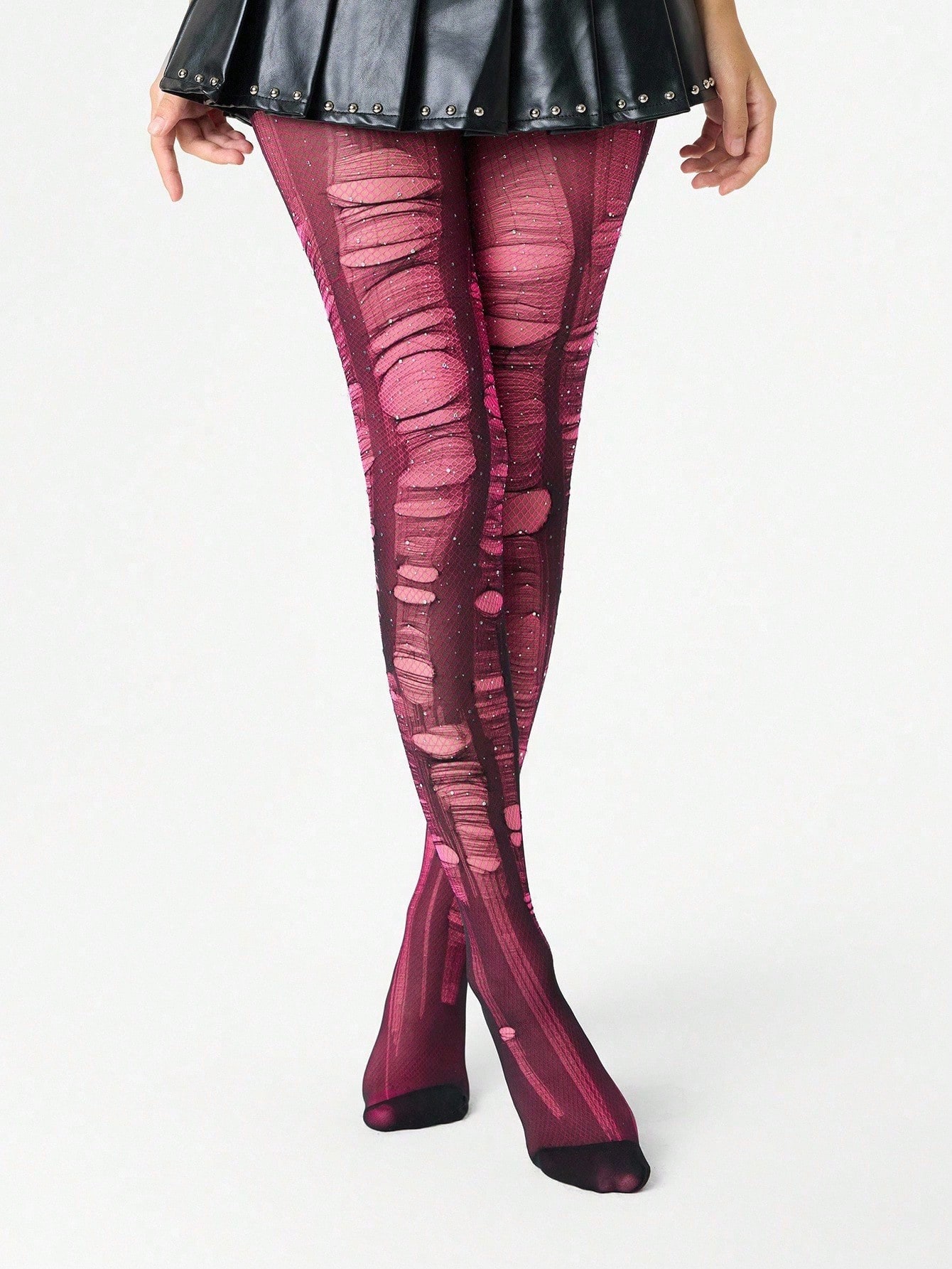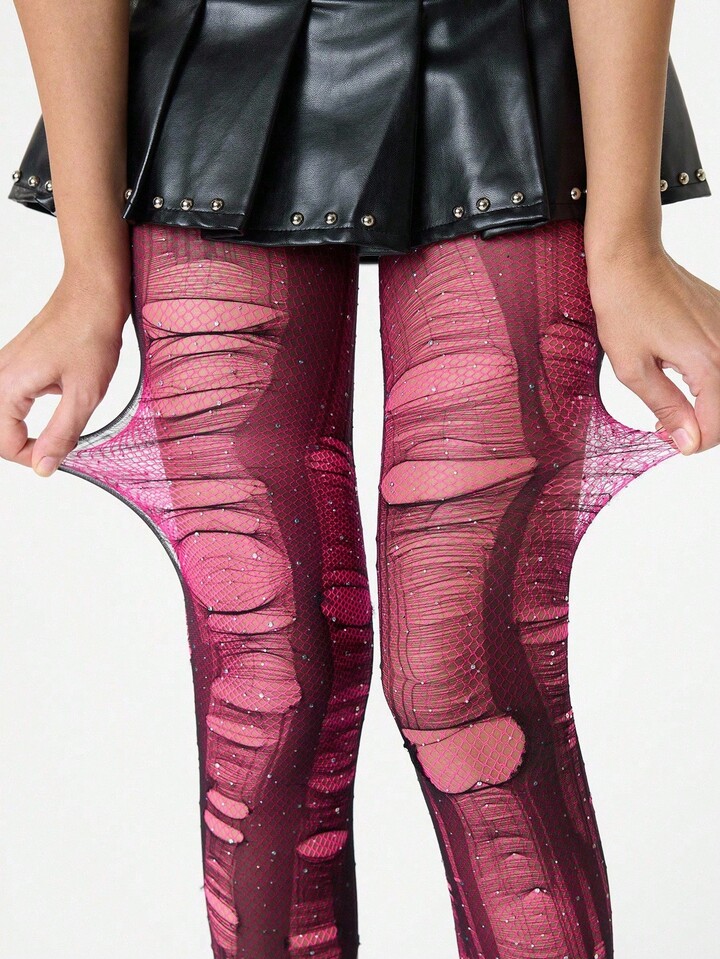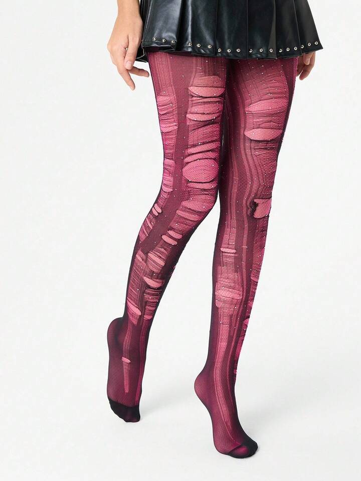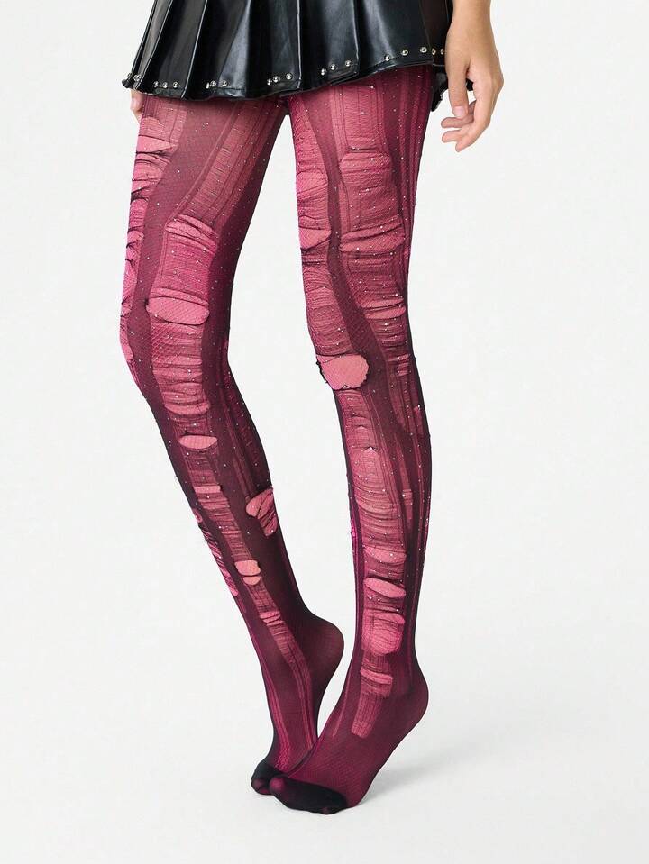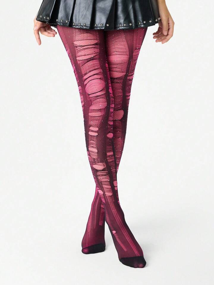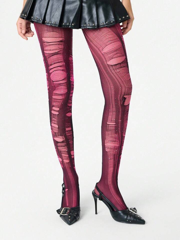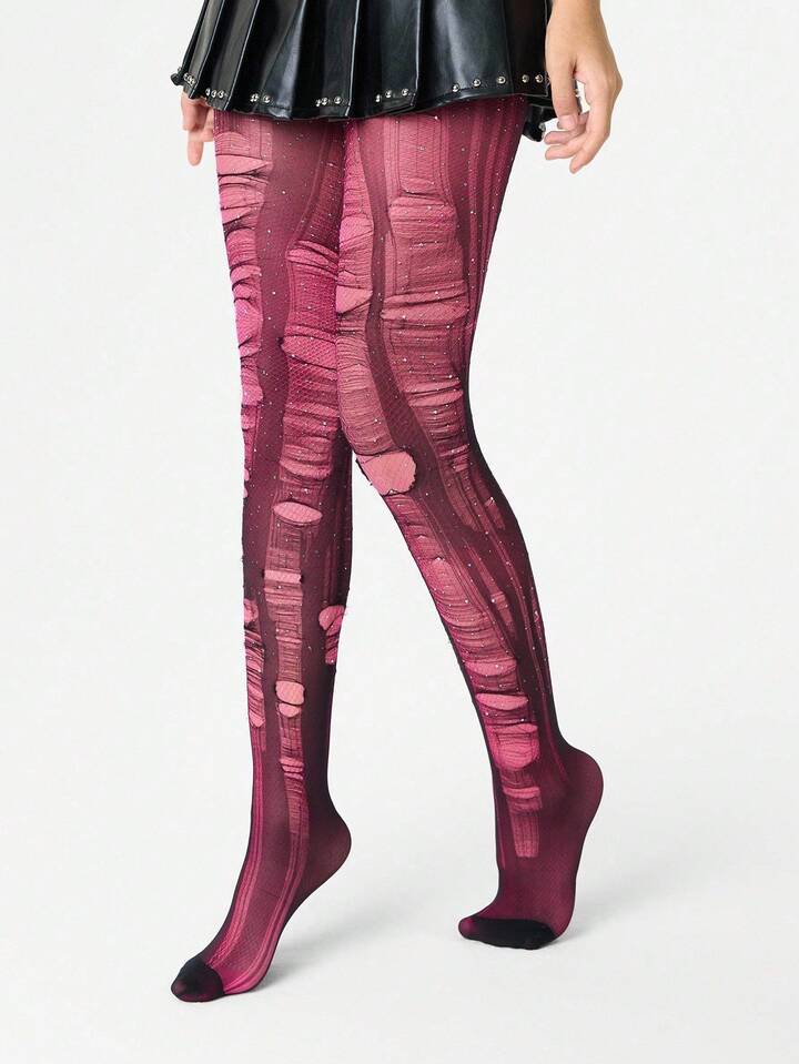 Grunge Punk 1pc Minimalist Sensual Rhinestone Fishnet Stockings In Dusty Rose + 2pcs Versatile All-Match Black Tights (Tights Need To Be Manually Torn)