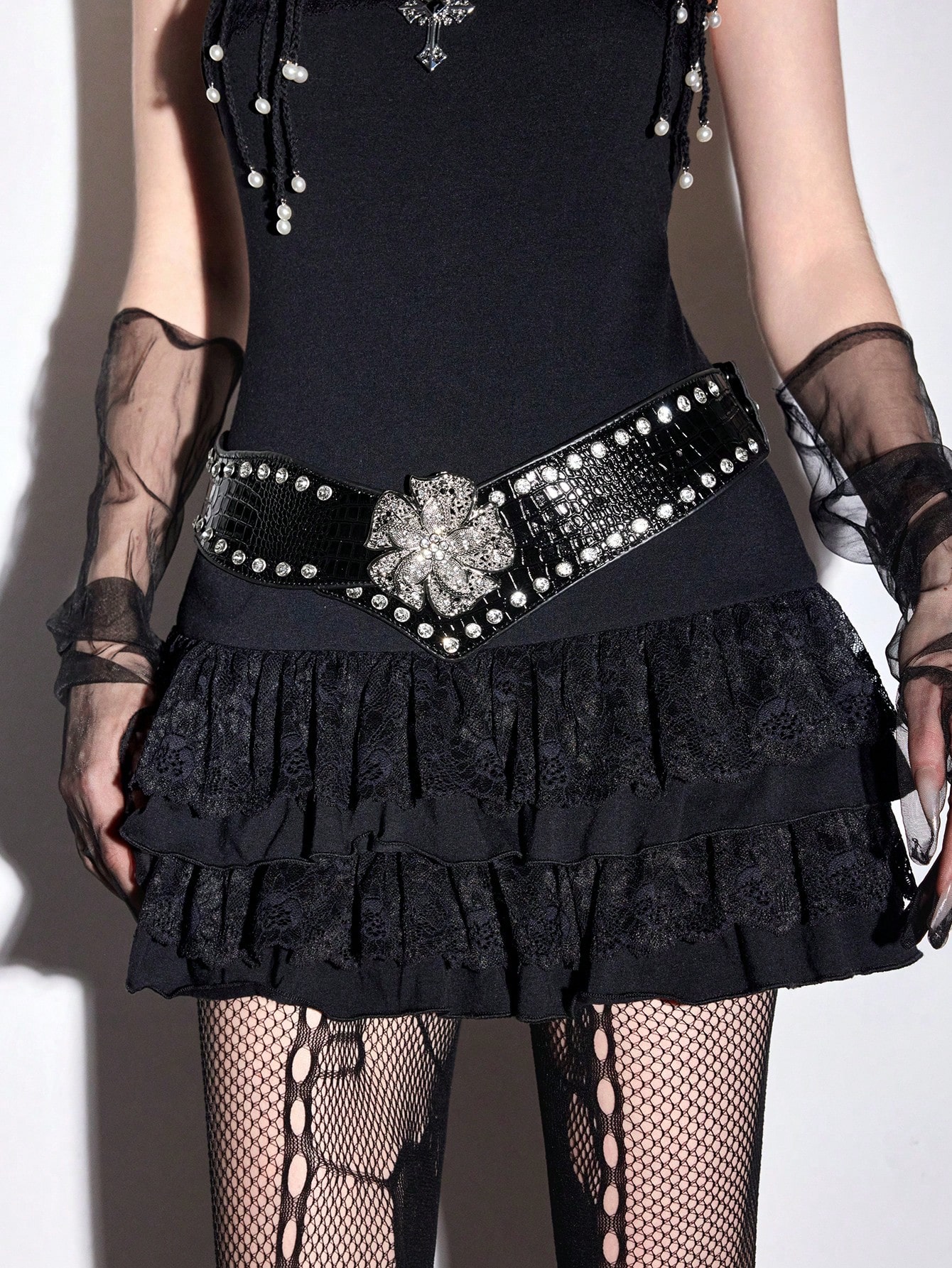 Grunge Punk 1pc Punk Rivet Rhinestone Flower Decor Wide Belt, Y2K Retro Fashion Studded Gem Metal Buckle Leather Belt, Personalized Decorative Belt