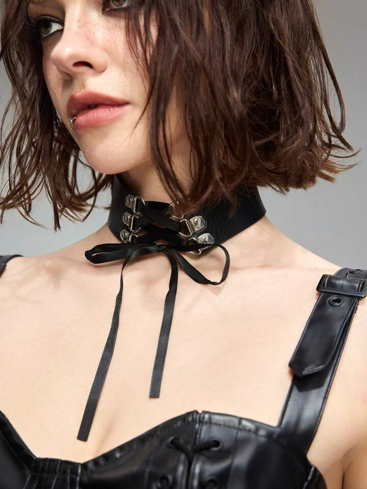 Grunge Punk 1pc Sexy Black Leather Strap Collar Necklace, Minimalist Sultry Lady Style Necklace Accessory, Unique Design Neck Decor