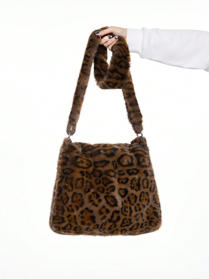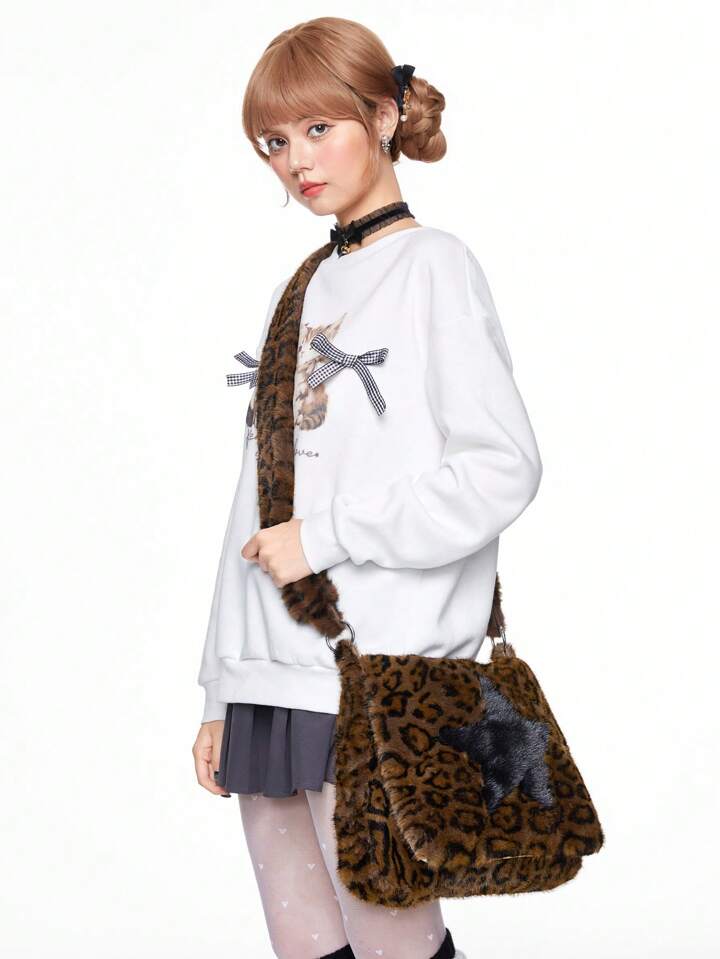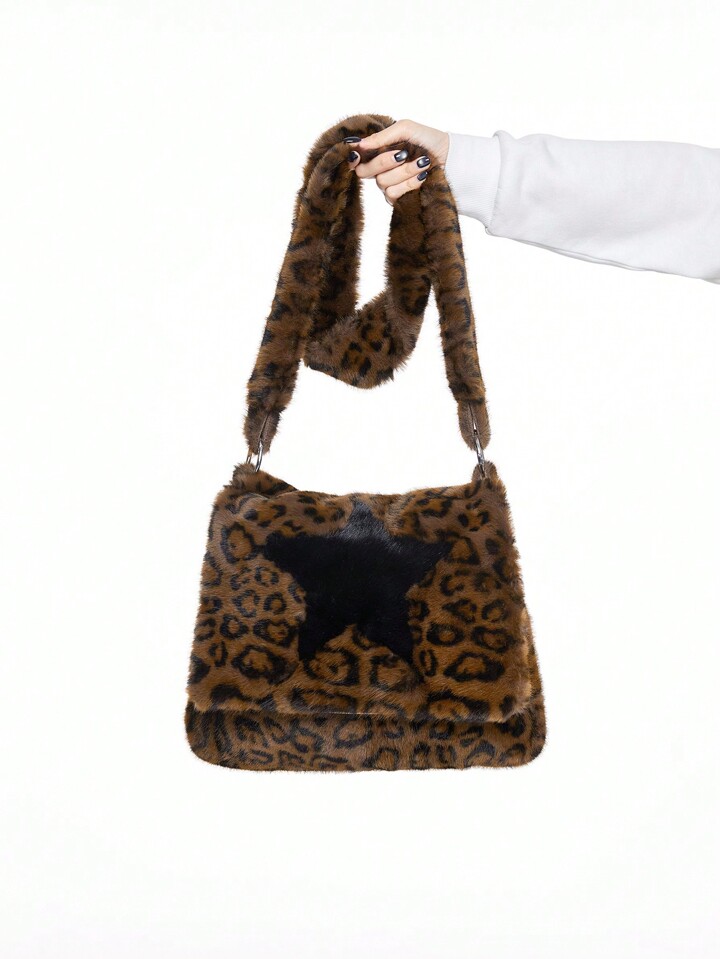 Grunge Punk 1pc Women Retro Leopard Plush Shoulder Bag, Contrast Color Flap Star Design, Casual Street Y2K Style, Autumn/Winter