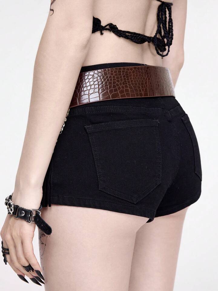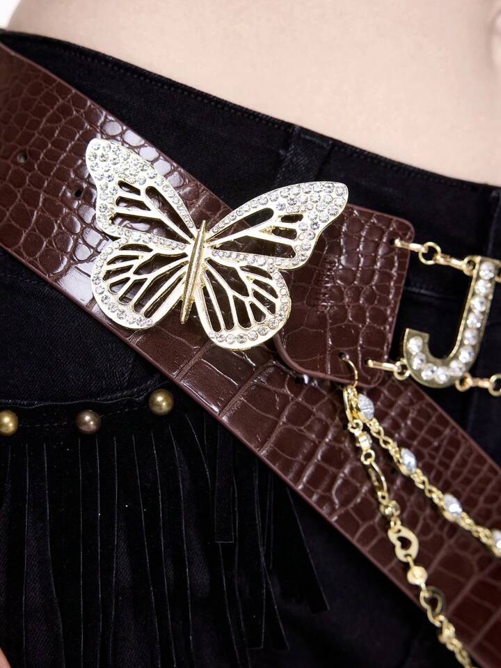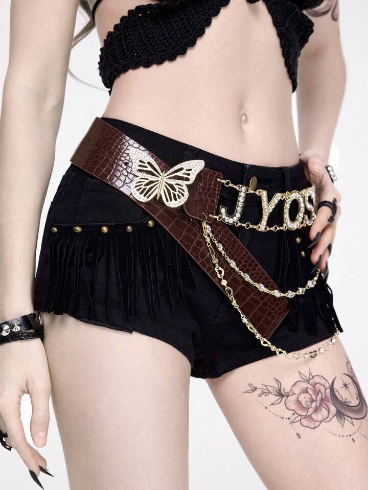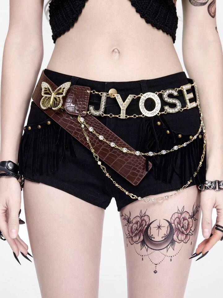 Grunge Punk 1pc Women's Brown Crocodile Leather Rhinestone Letter Double Layer Chain Decor Western Style Belt, Versatile For Dress, Jeans & Daily Wear