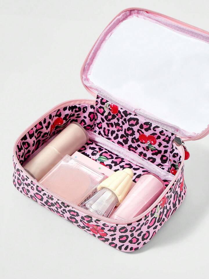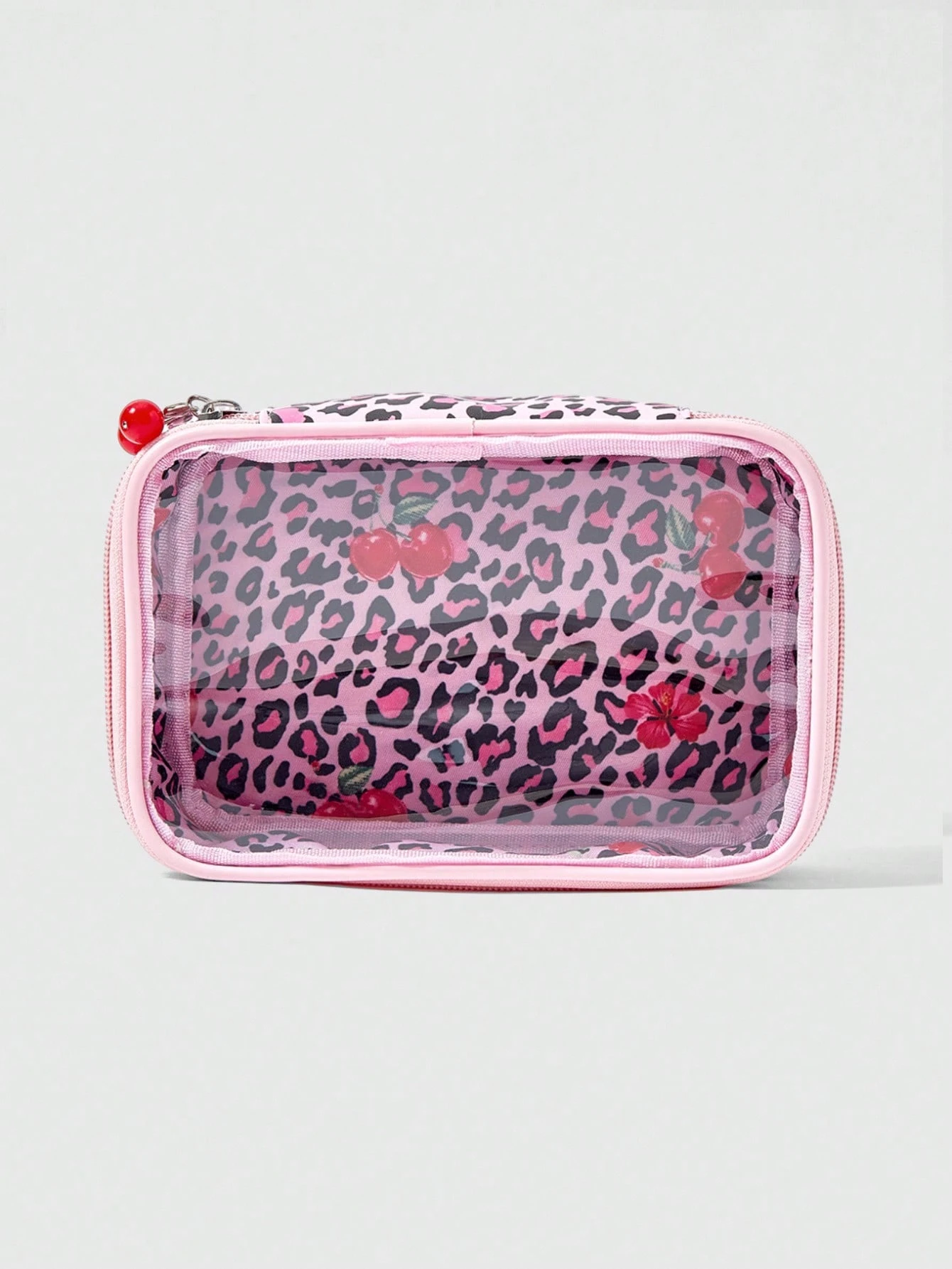 Grunge Punk 1pc Women's Retro Cute Y2K Leopard & Cherry Portable Cosmetic Bag