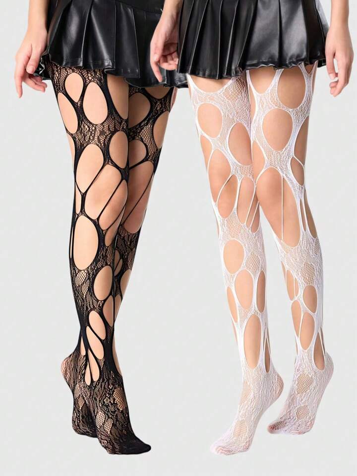 Grunge Punk 2 Pairs Women Dark Color Torn Hole & Fishnet Socks, Suitable For All Seasons