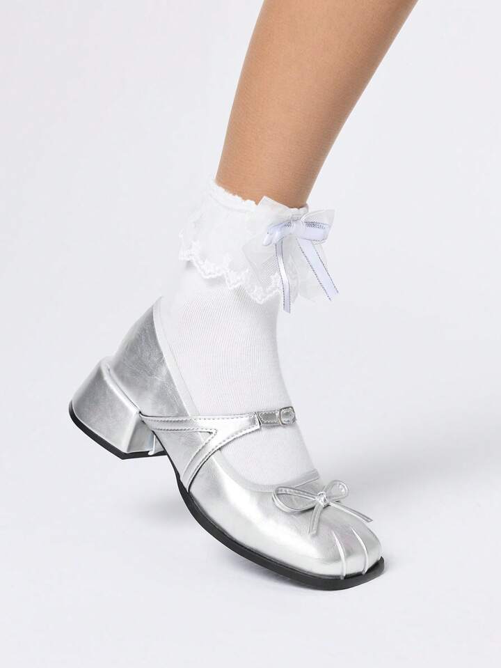 Grunge Punk 2025 Spring New Fashion Bow Mary Jane Shoes Women Silver Pumps Thick Heels Low-Top Leather Shoes