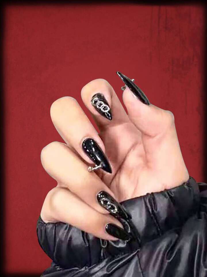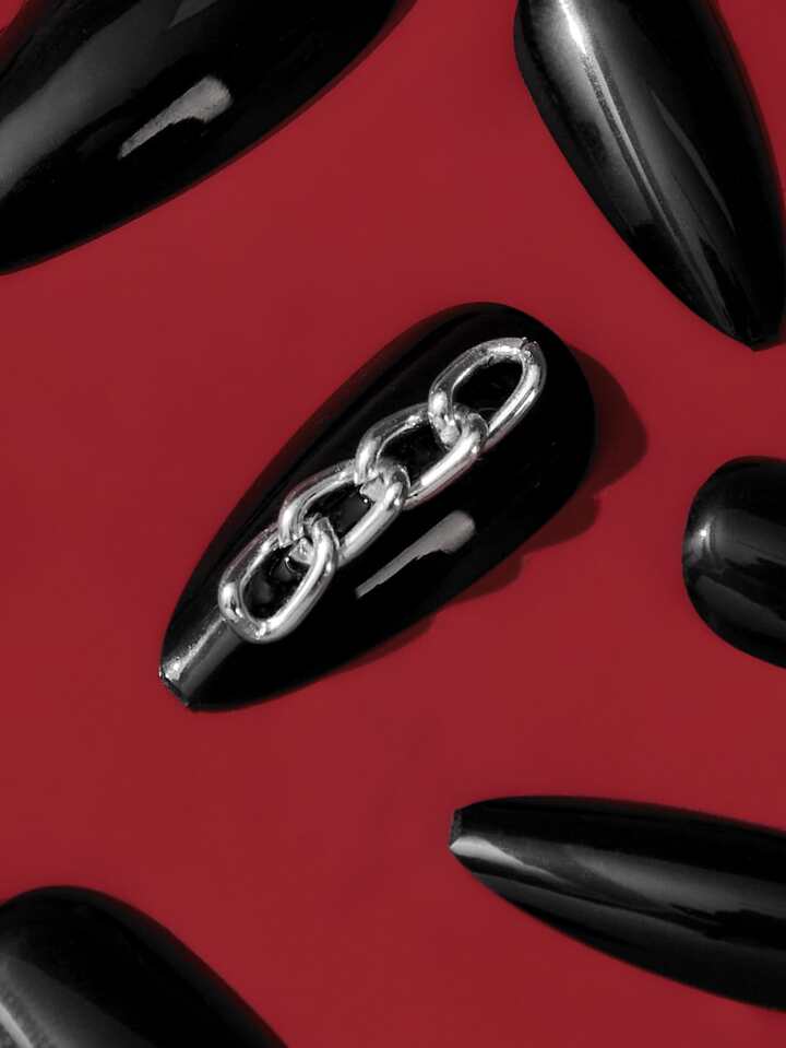 Grunge Punk 24pcs Long Almond 3D Chain Decor Fake Nail & 1sheet Tape