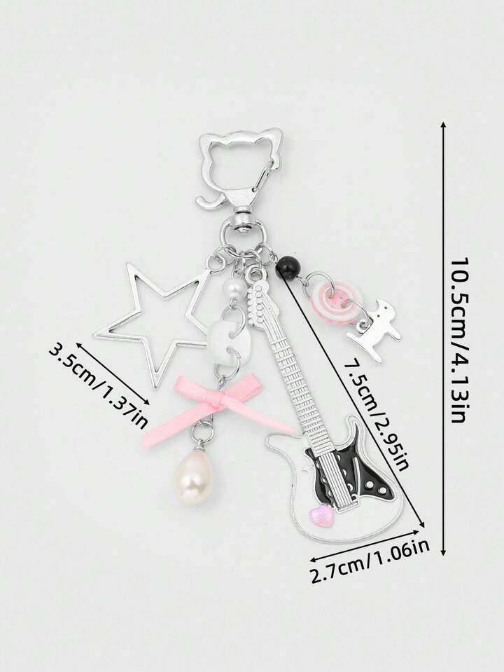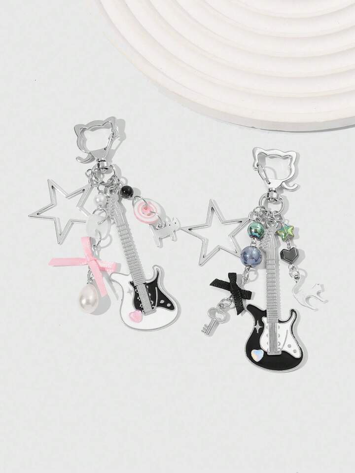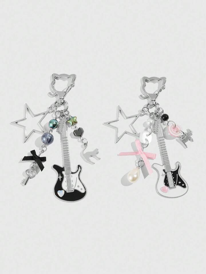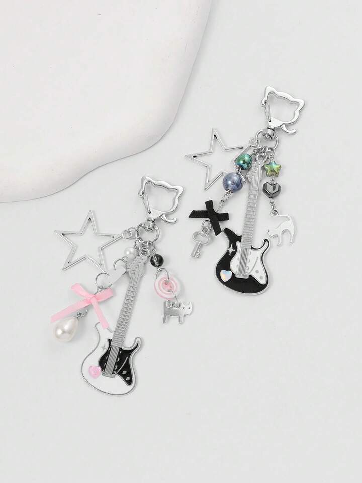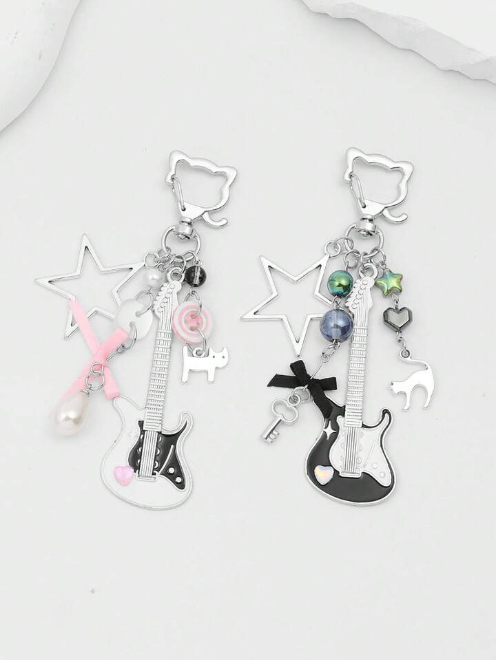 Grunge Punk 2pcs Y2K Style Music Festival Cat Guitar Key Chain, Suitable For Couples Or Friendship Gift