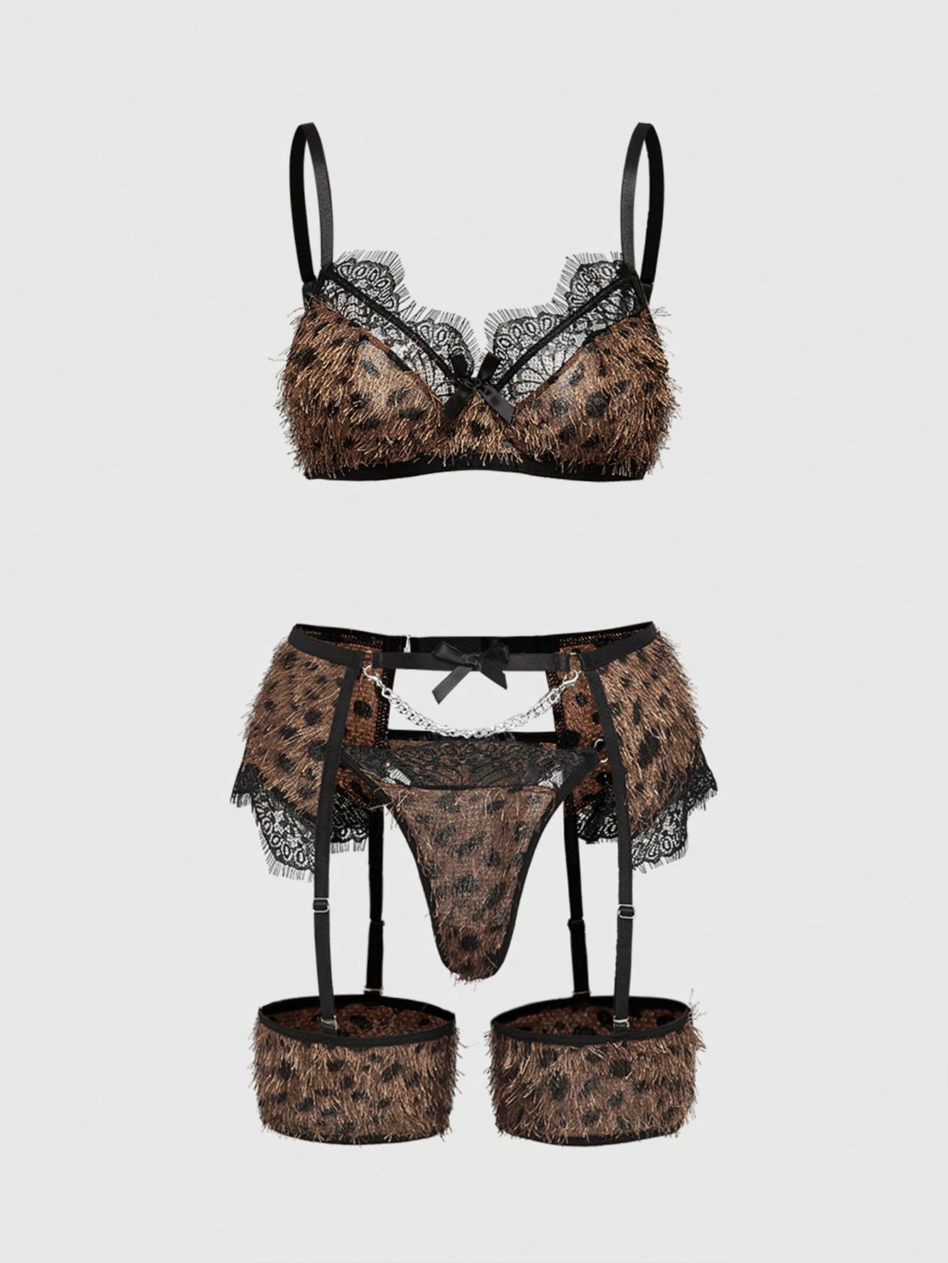 Grunge Punk 3pcs/Set Punk Wild Mosquito Leopard Print Metal Chain Sports Bra, Thong Panty, And Garter Belt Sexy Lingerie Set