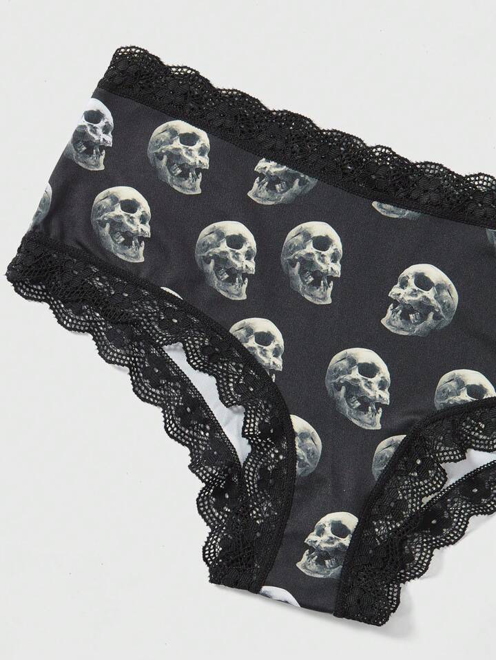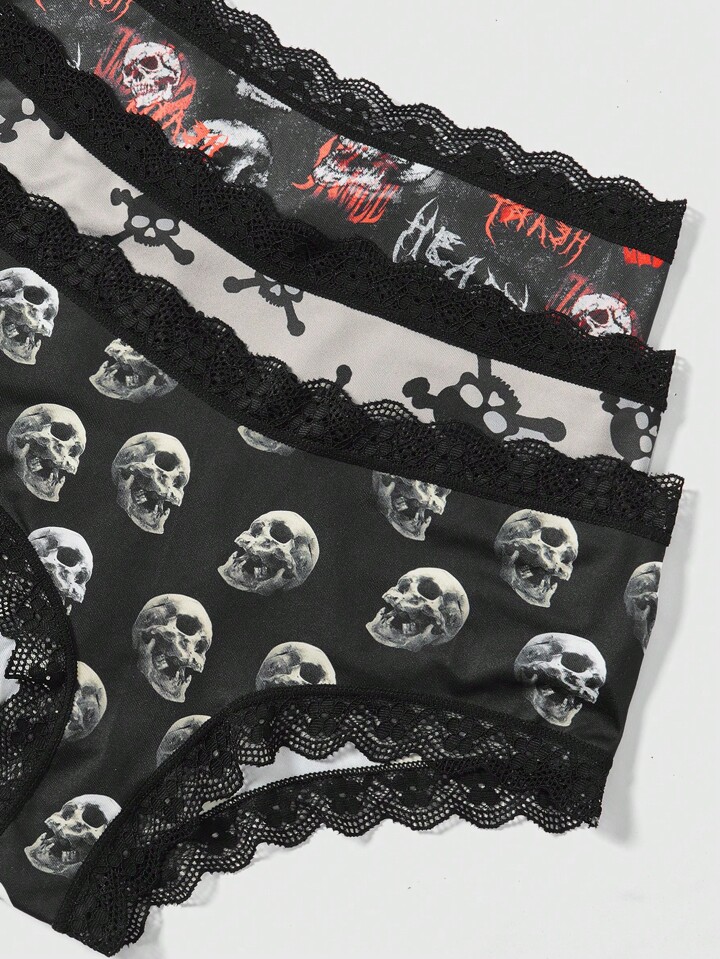 Grunge Punk 3pcs Skull Print Contrast Lace Panty Sets