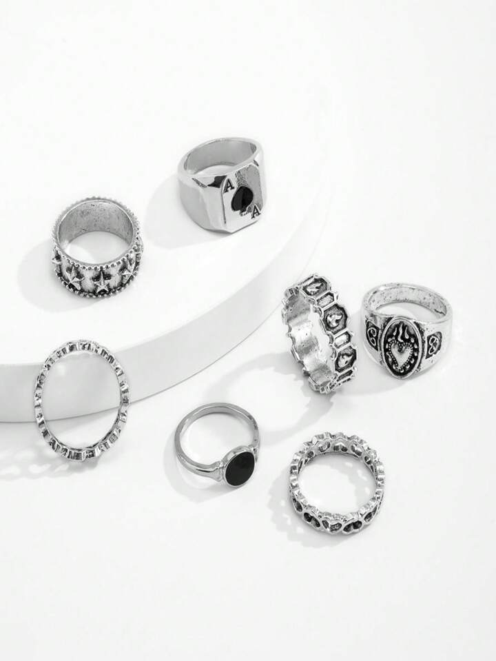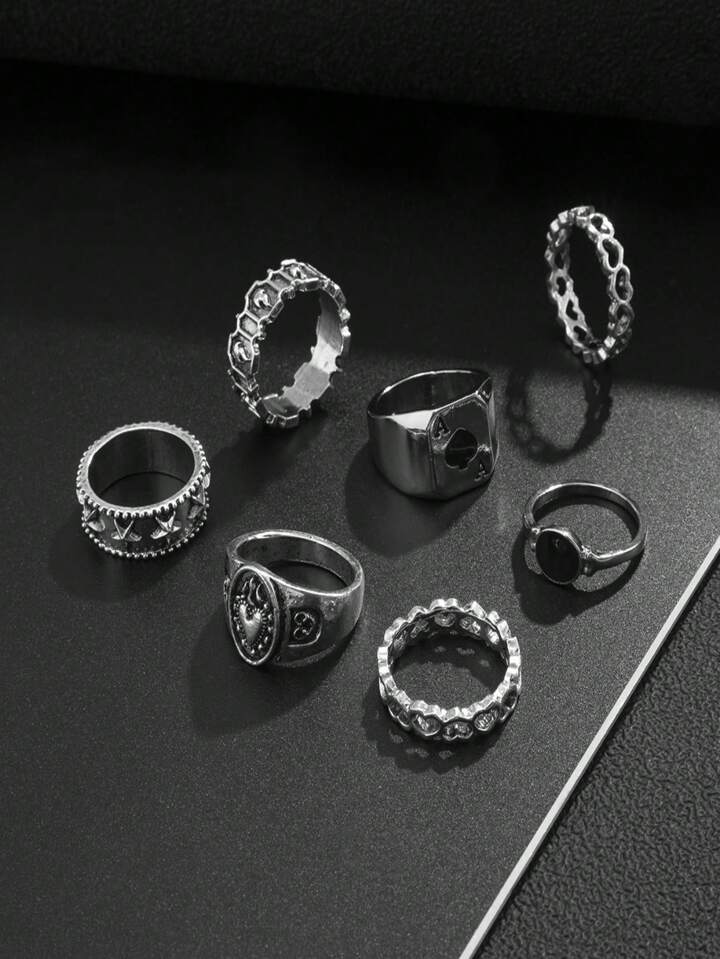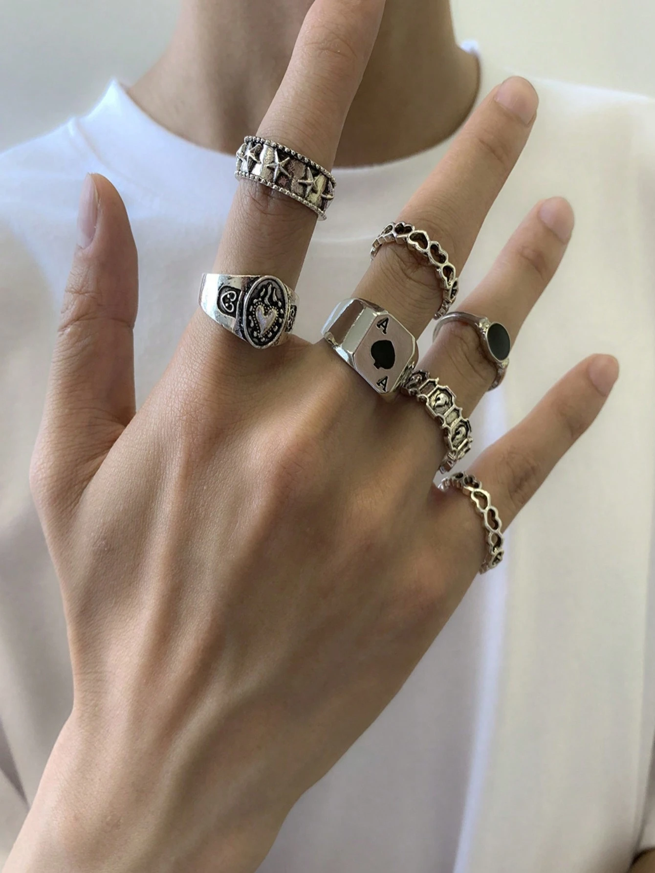 Grunge Punk 7pcs Funky Zinc Alloy Playing Card Decor Ring For Women For Daily Decoration