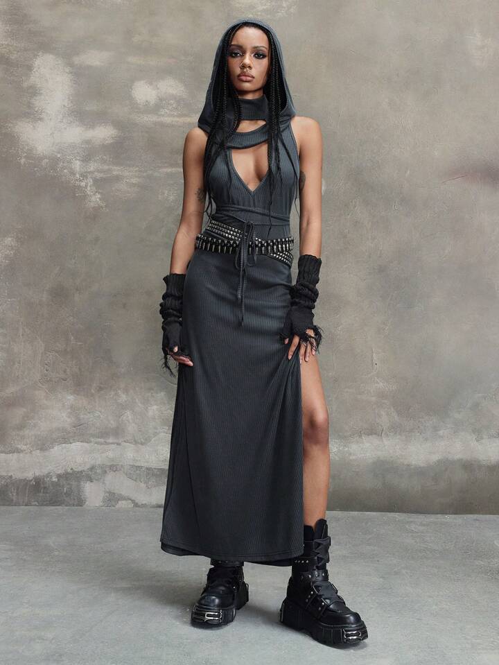 Grunge Punk Apocalyptic Style Women Hollow Out Cinched Waist Up High Slit Vintage Rib Knit Fabric Hooded Dress