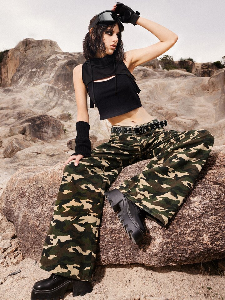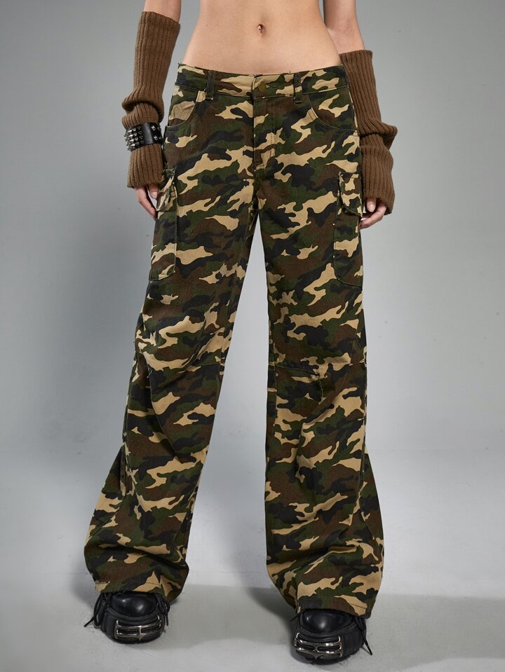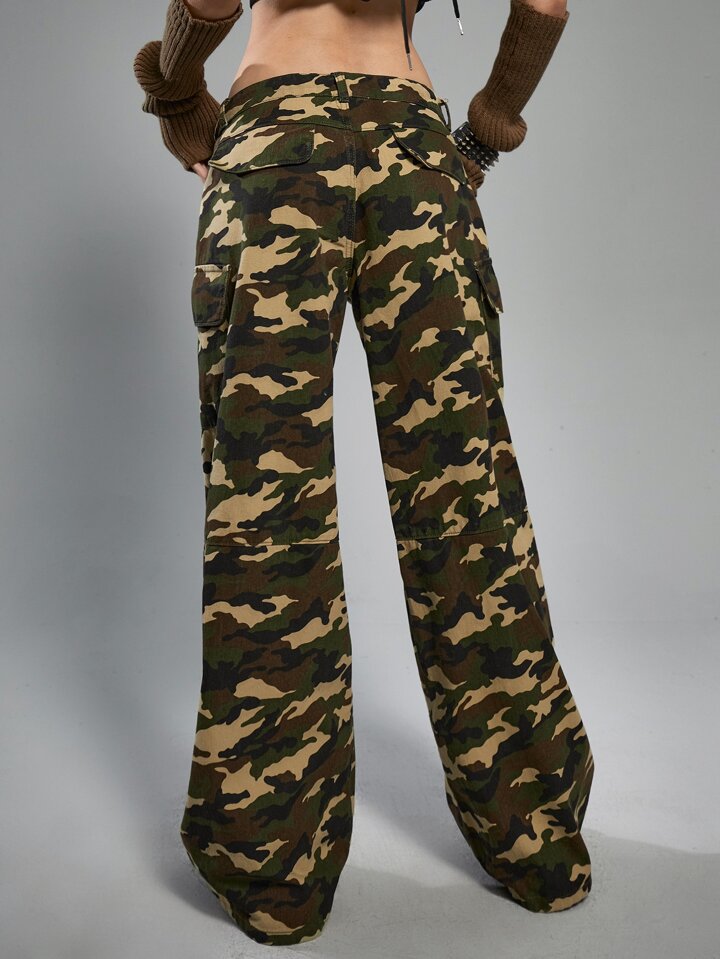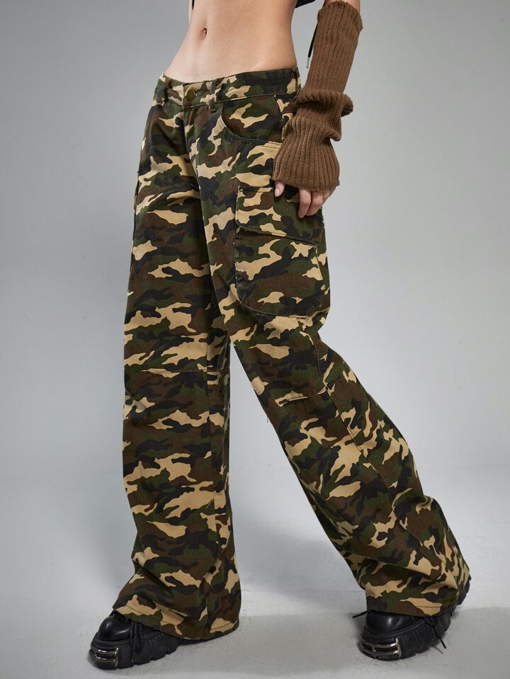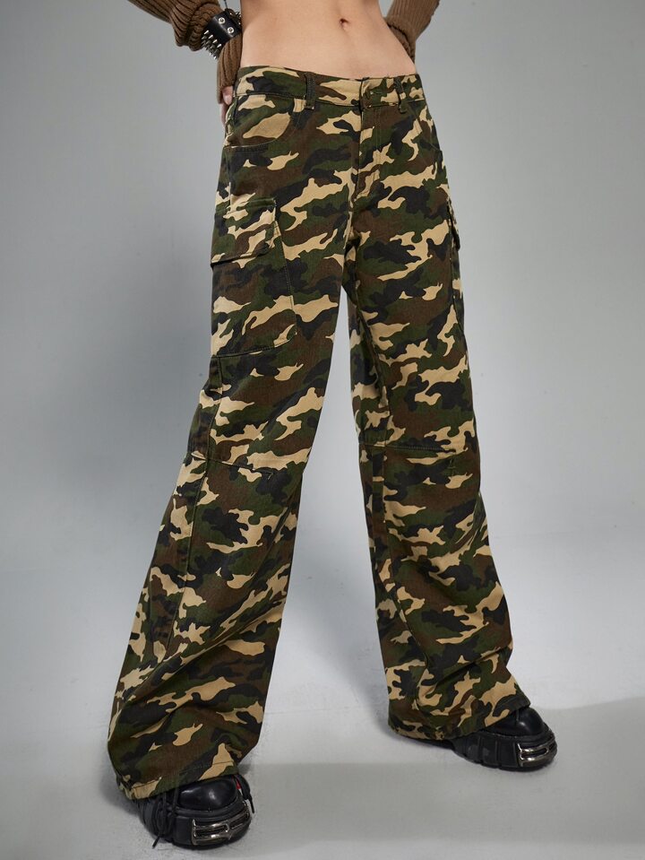 Grunge Punk Camo Print Flap Pocket Drop Waist Cargo Jeans