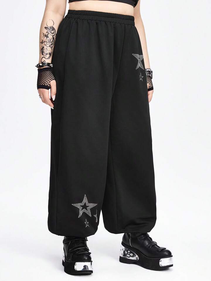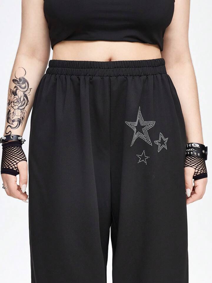 Grunge Punk Casual And Punk Style Loose Wide Leg Trousers For Plus Size Women With Star Hot Drilling