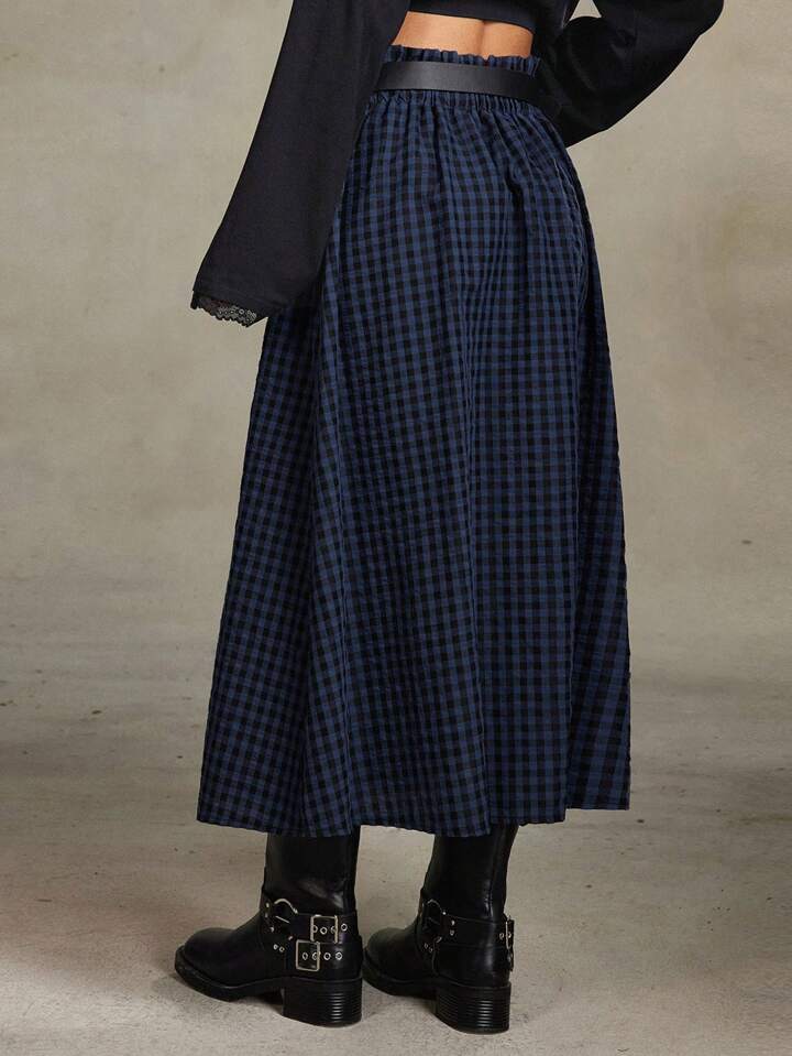 Grunge Punk Casual Retro Plaid Patchwork Belted High Waisted Midi Skirt For Women