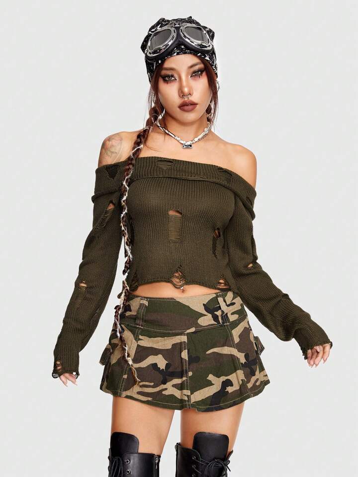 Grunge Punk Cold Shoulder Foldover Front Sweater