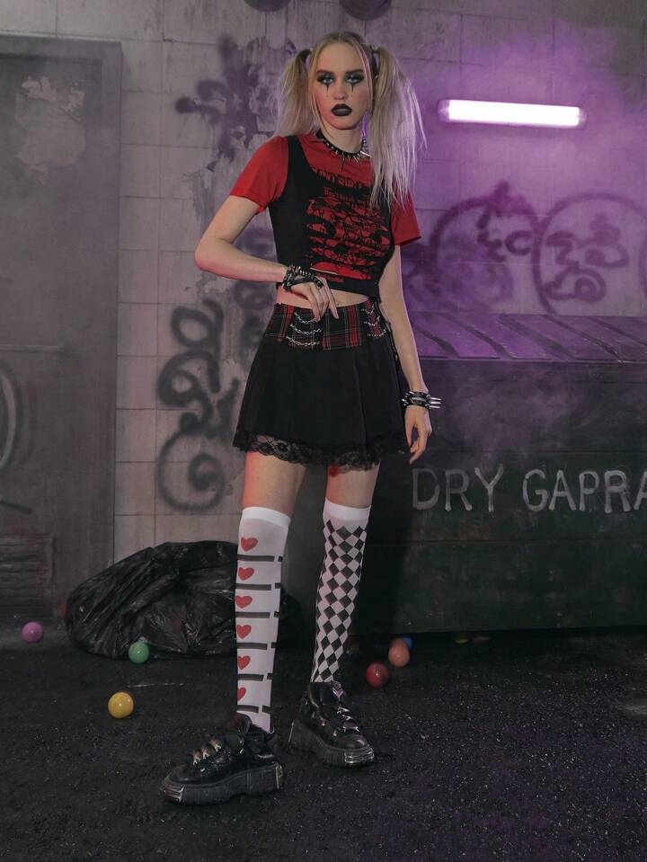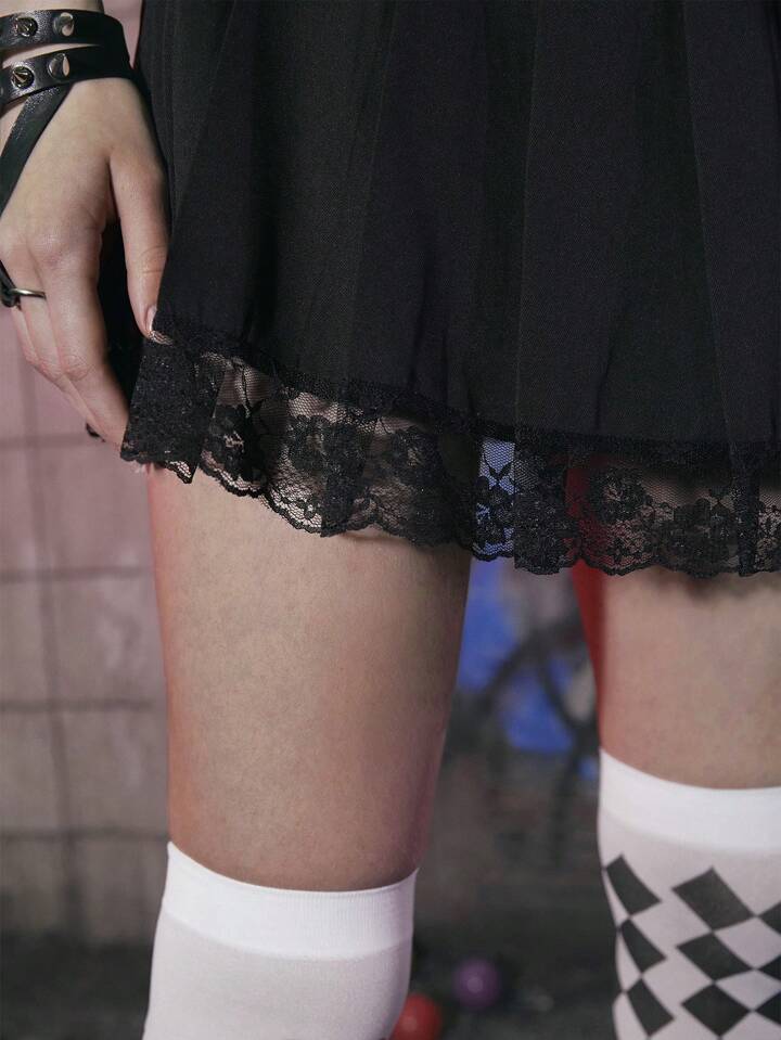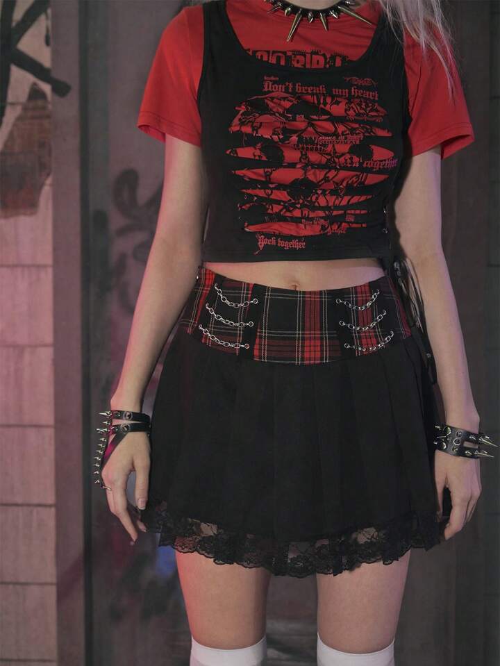 Grunge Punk Contrast Lace Plaid Chain Decor Pleated Skirt
