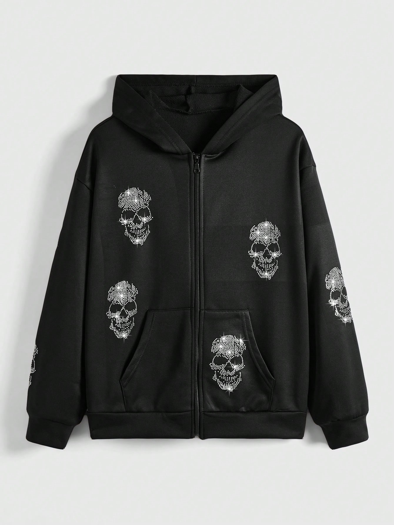 Grunge Punk Embellished Rhinestone Skull Printed Zip Up Hoodie