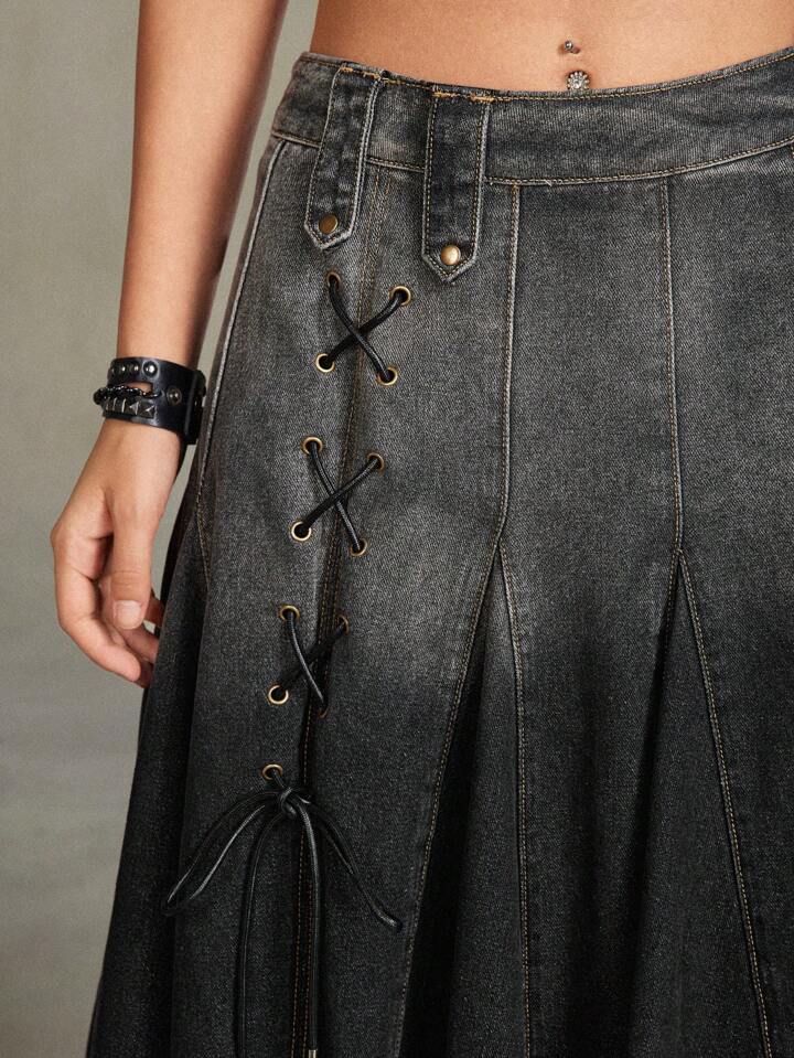 Grunge Punk Fashionable Asymmetrical Hem Frayed A-Line Denim High Waist Skirt, Vintage Streetwear Style