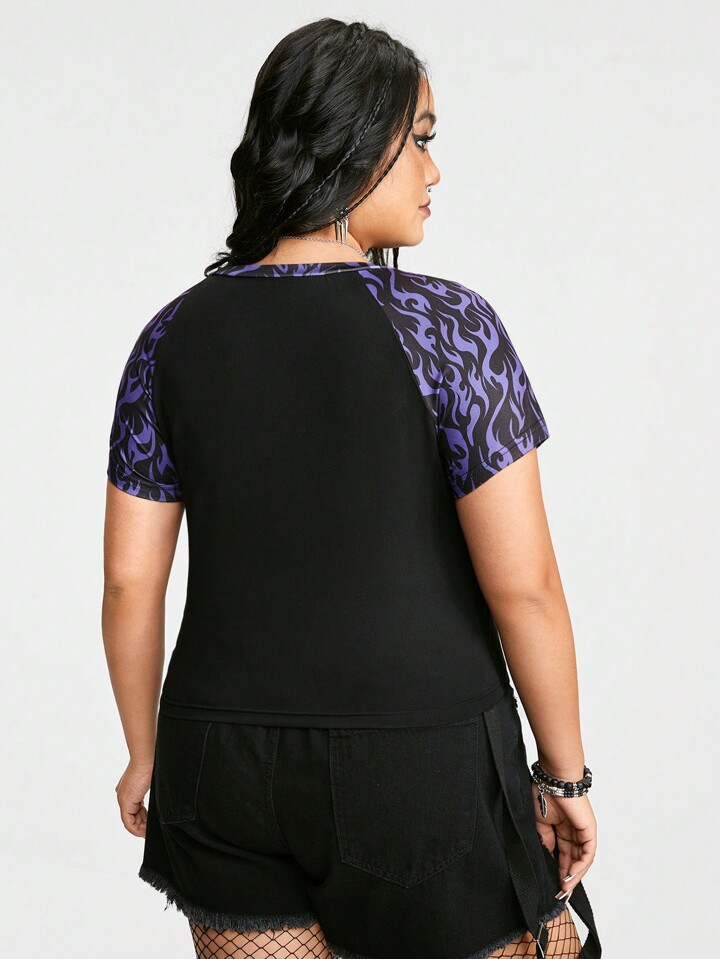 Grunge Punk Fashionable Plus Size Women's Flame Printed Rhinestone Decor Tight T-Shirt With Raglan Sleeve For Motorcycle Lovers