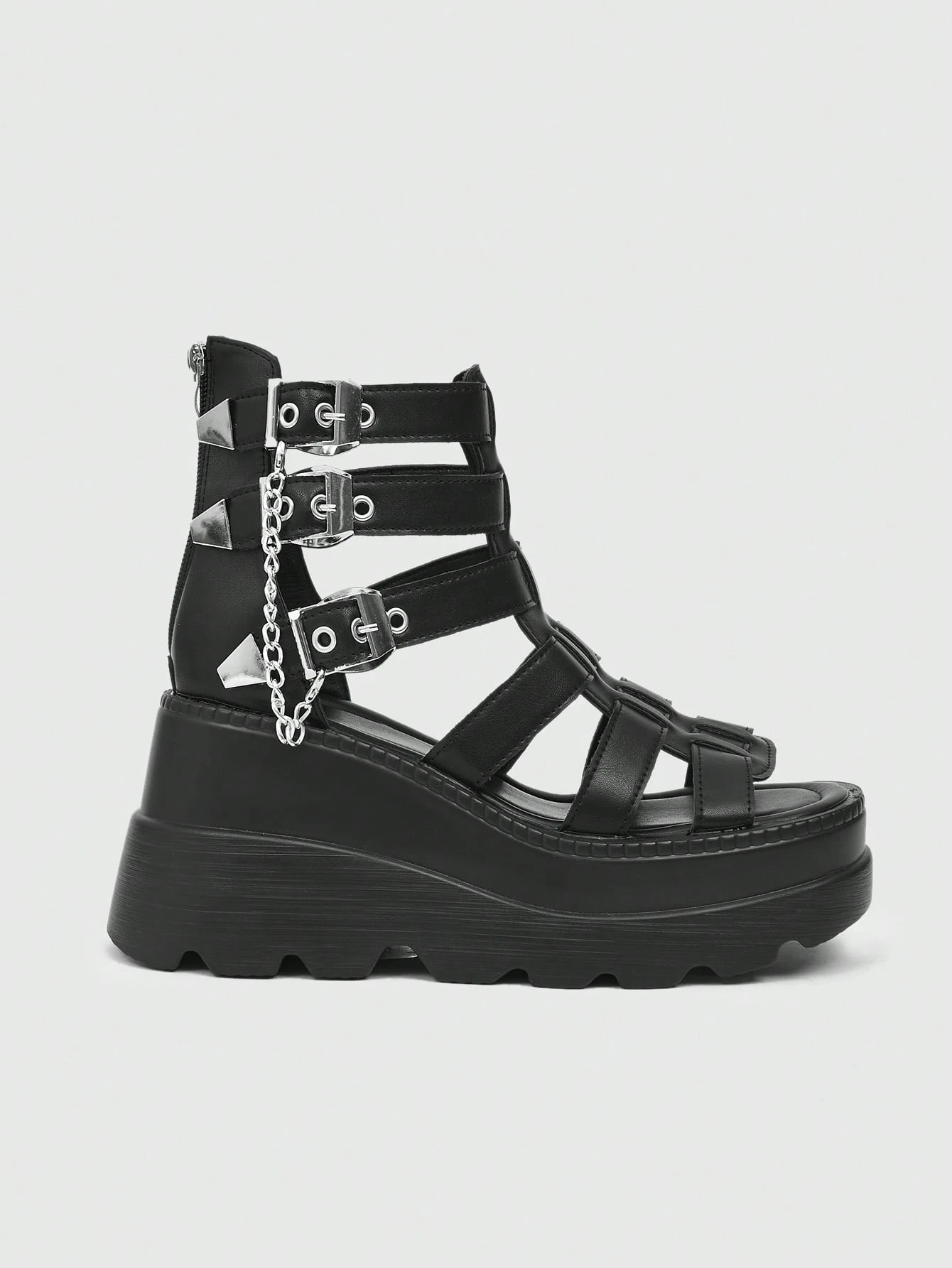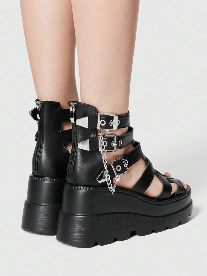 Grunge Punk Fashionable Women Shoes With Metal Buckle Design Open-Toe, Platform Wedge Heel 7.5cm, Vintage Style PU Leather Black Sandals, Suitable For Summer Outings And Dates
