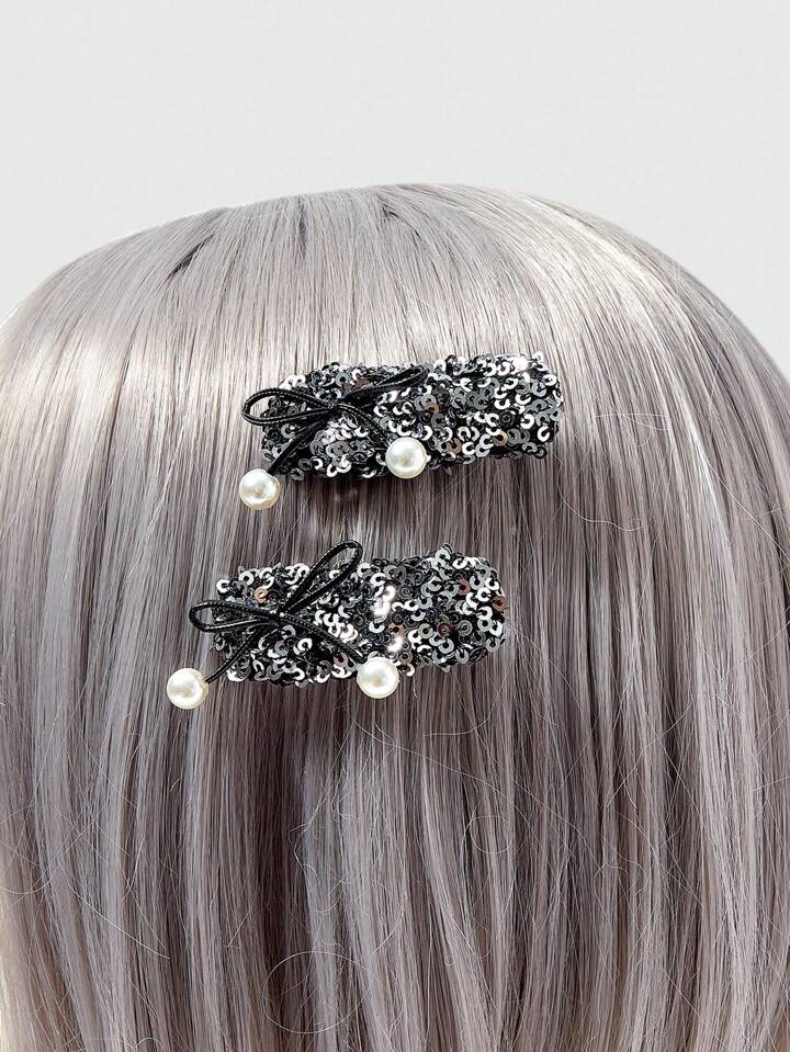 Grunge Punk Faux Pearl Bow Silver Rectangle Hair Clip, Suitable For Everyday Wear