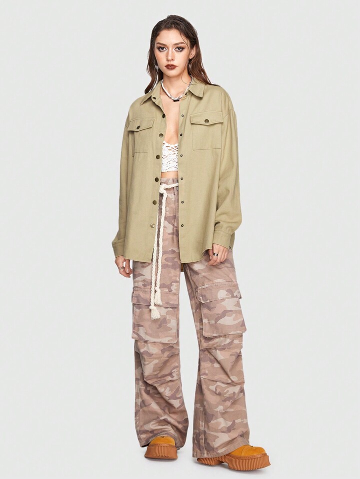 Grunge Punk Flap Pocket Drop Shoulder Snap Button Front Coat
