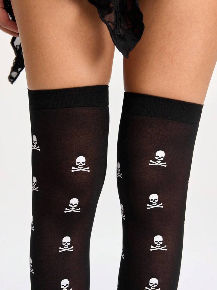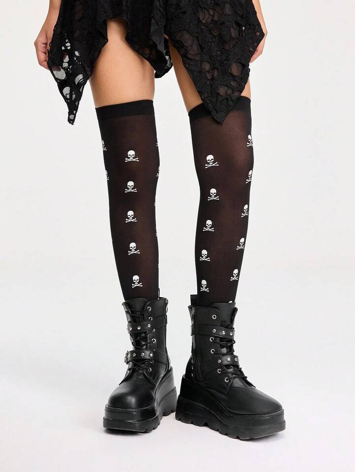 Grunge Punk Gothic Black Random Skull Print Thigh High Socks, Punk Street Fashion Versatile Over Knee Socks Suitable For Party, Gathering, Social Events, Halloween
