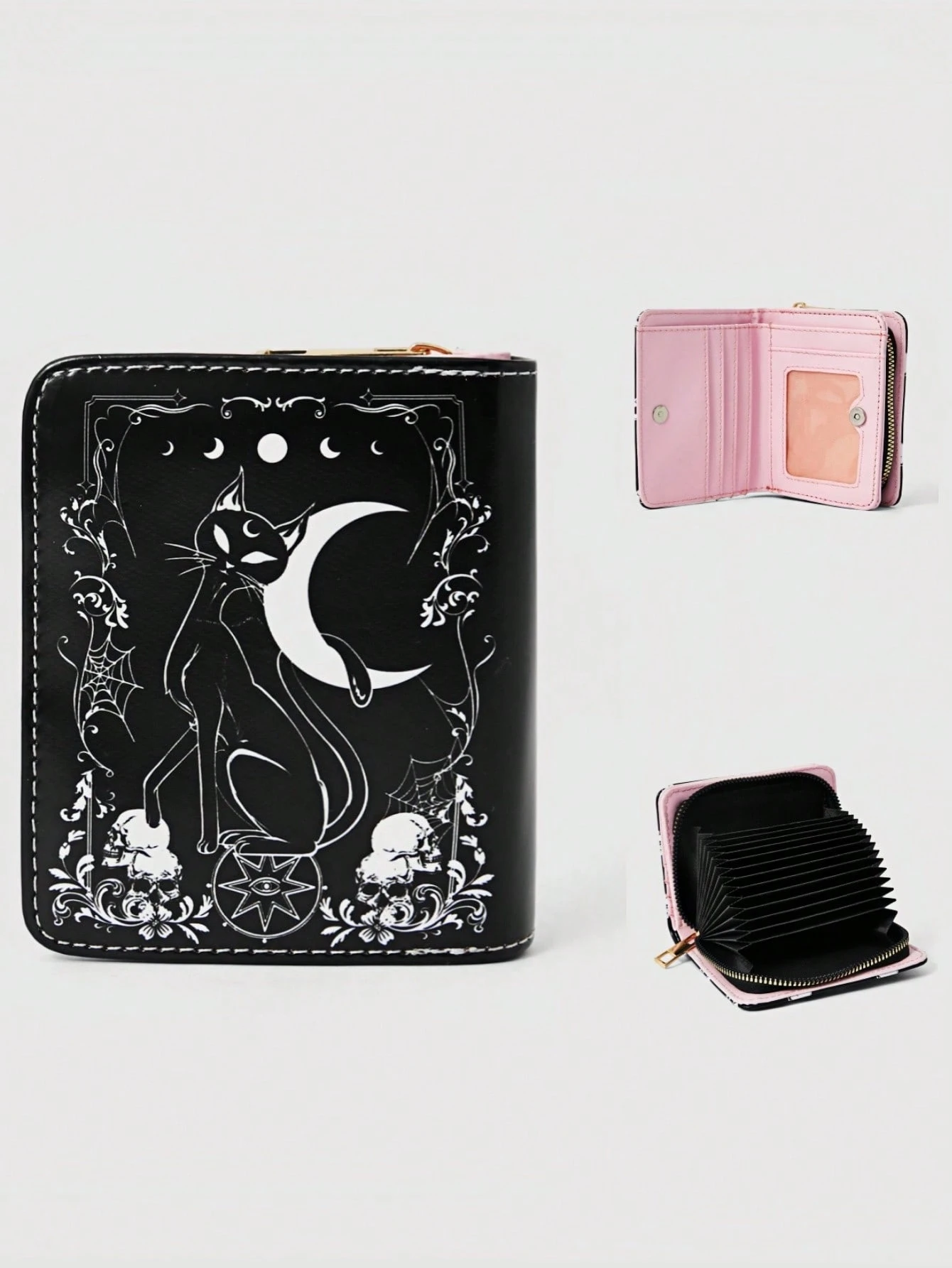 Grunge Punk Gothic Creativity Moon & Black Cat Multi-Function Zipper Card Holder With Bifold Wallet