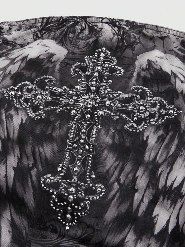 Grunge Punk Gothic Cross & Rhinestone Wing Printed Vintage Ruched Sexy Women's Bandeau Tube Top, Black