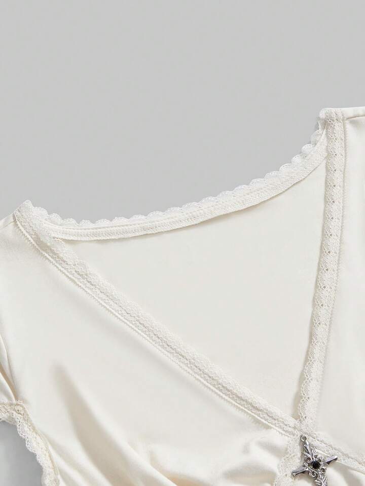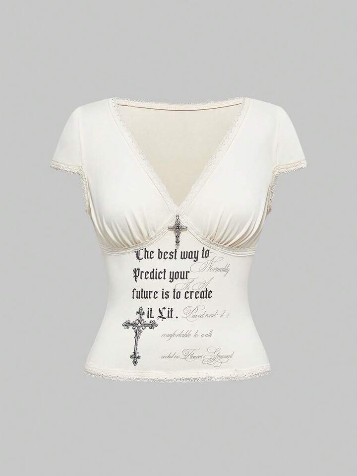 Grunge Punk Gothic Cross Slogan Poem Chain Pattern Black Print Women T-Shirt