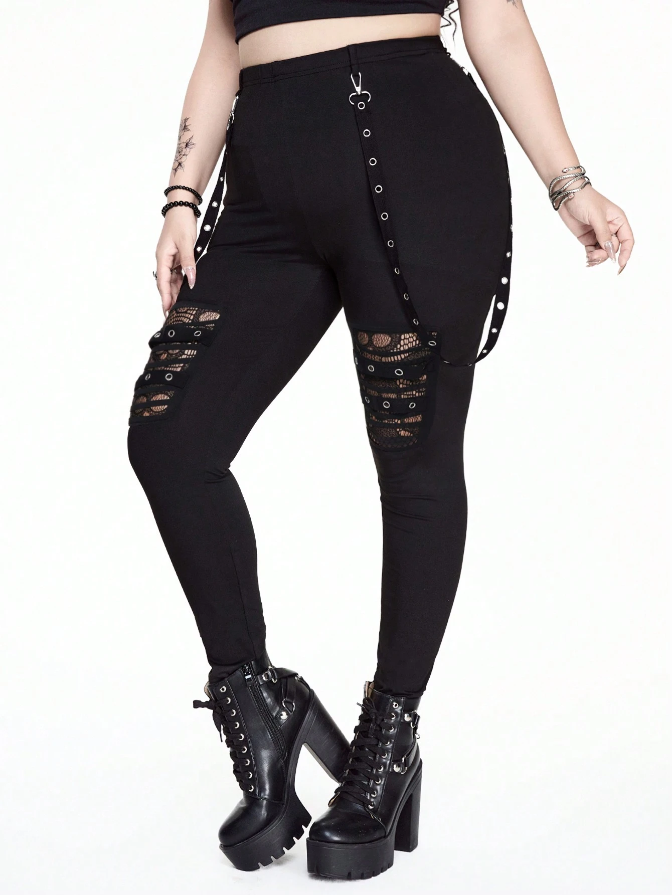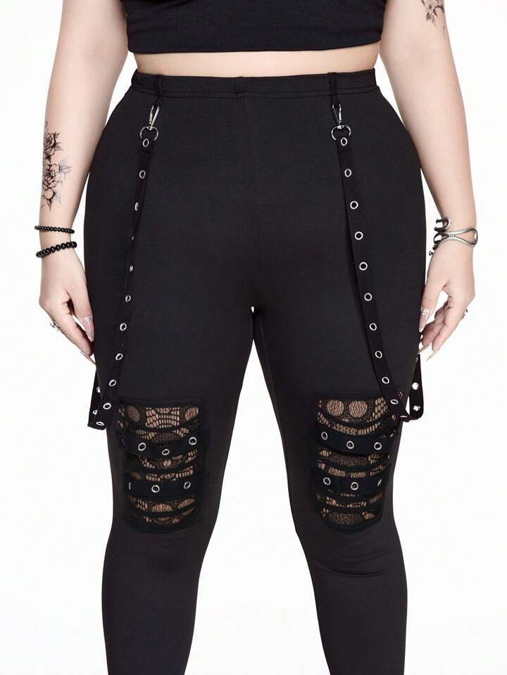 Grunge Punk Gothic Punk Skeleton Lace Patchwork Metal Buckle Decor Plus Size Women Leggings With Detachable Waistband