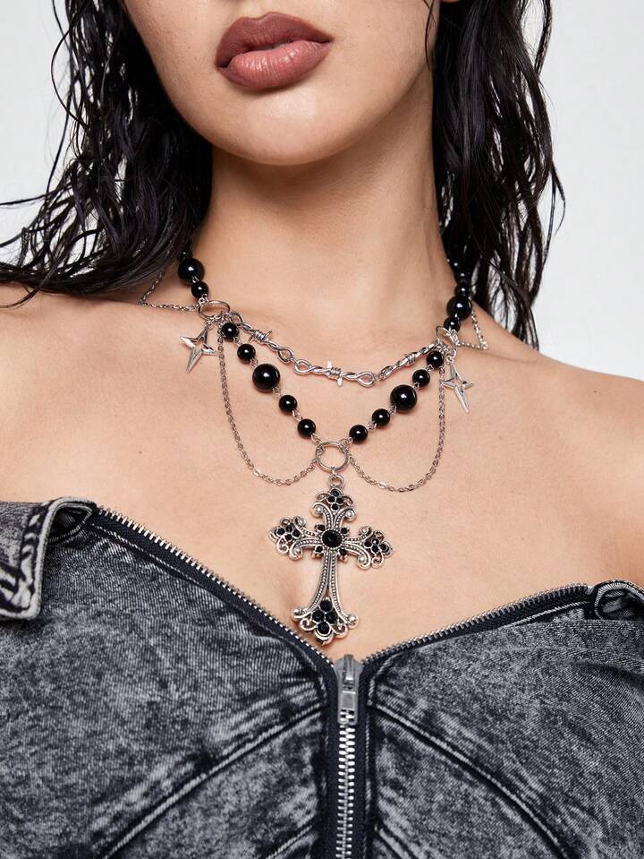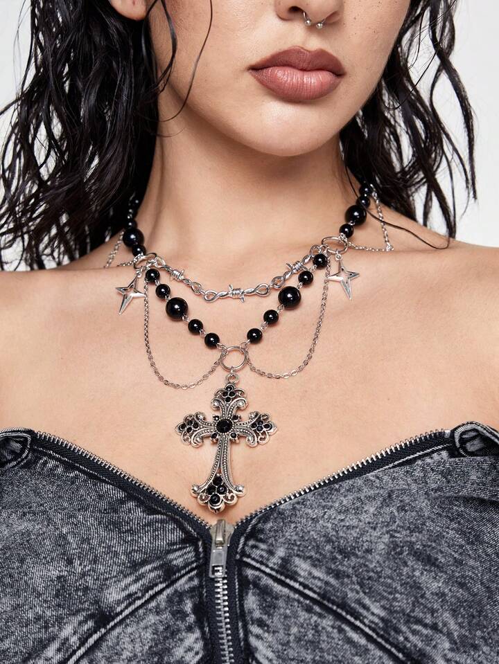 Grunge Punk Gothic Style Luxury Black Crystal Cross & Beaded Multilayer Necklace For Women