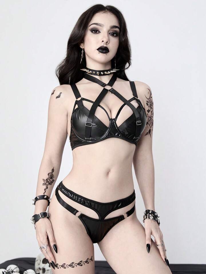 Grunge Punk Gothic Style PU Material Underwired Halter Bralette And Heart Metal Garter Thong Lingerie Set