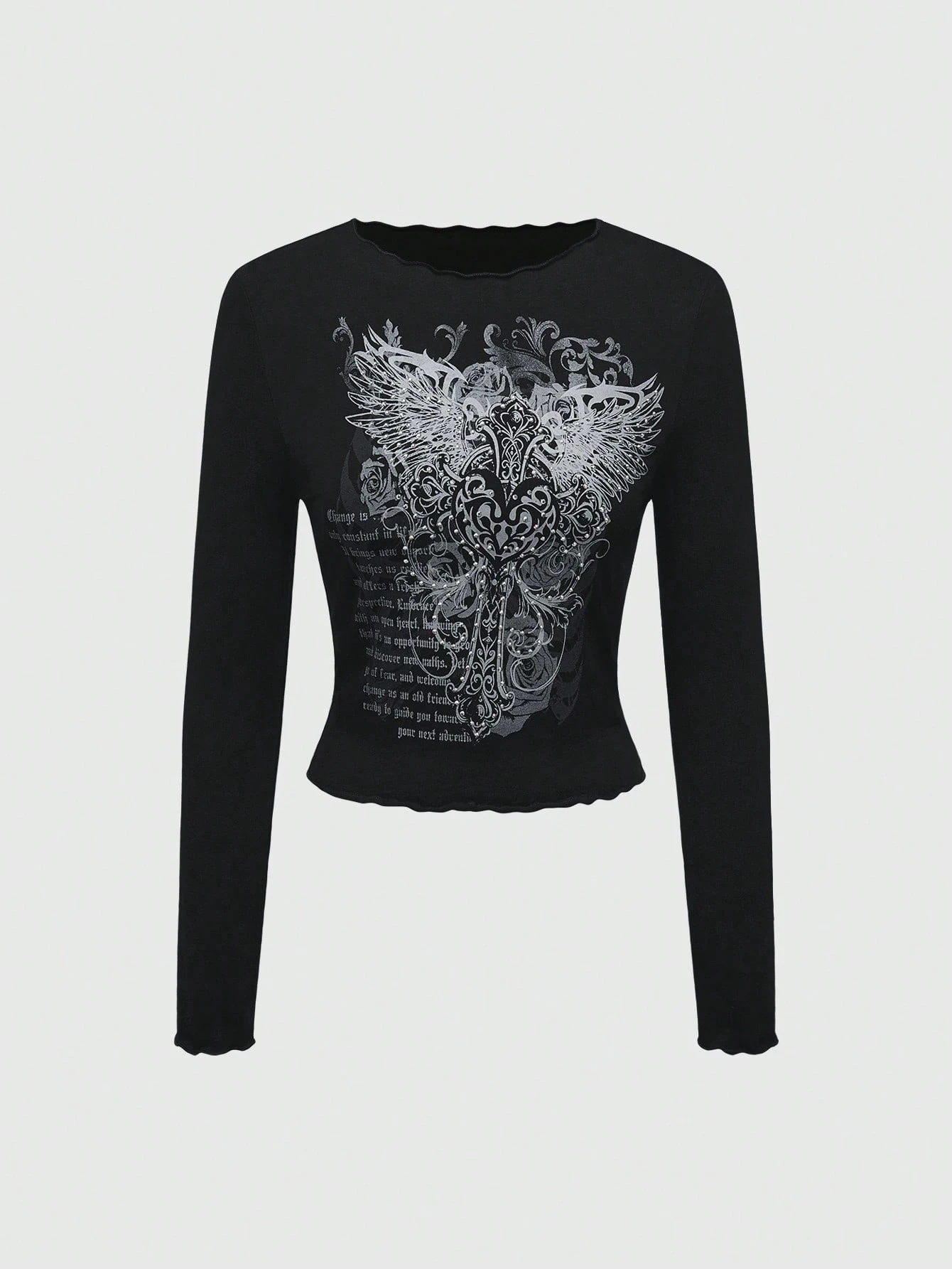 Grunge Punk Grunge Oversized Gothic Print Glitter Rhinestones Round Neck Slim Fitted Sheer Women T-Shirt
