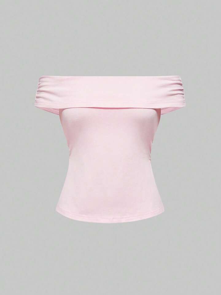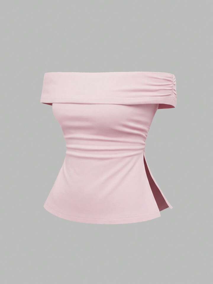 Grunge Punk Grunge Y2K Subculture Leopard Print Hem Slit Off Shoulder T-Shirt For Women, Versatile & Practical, Pink