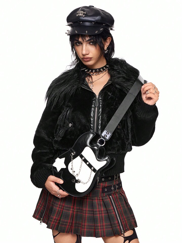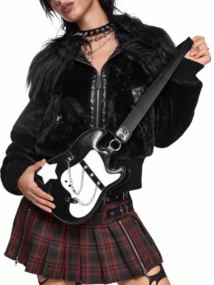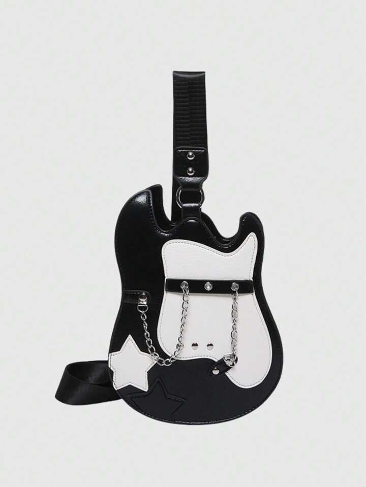 Grunge Punk Guitar-Shaped Black & White Star Color Block Accent Crossbody Bag With Chain, Y2K Punk Rock Style, Suitable For Casual Outing, Gathering, Party