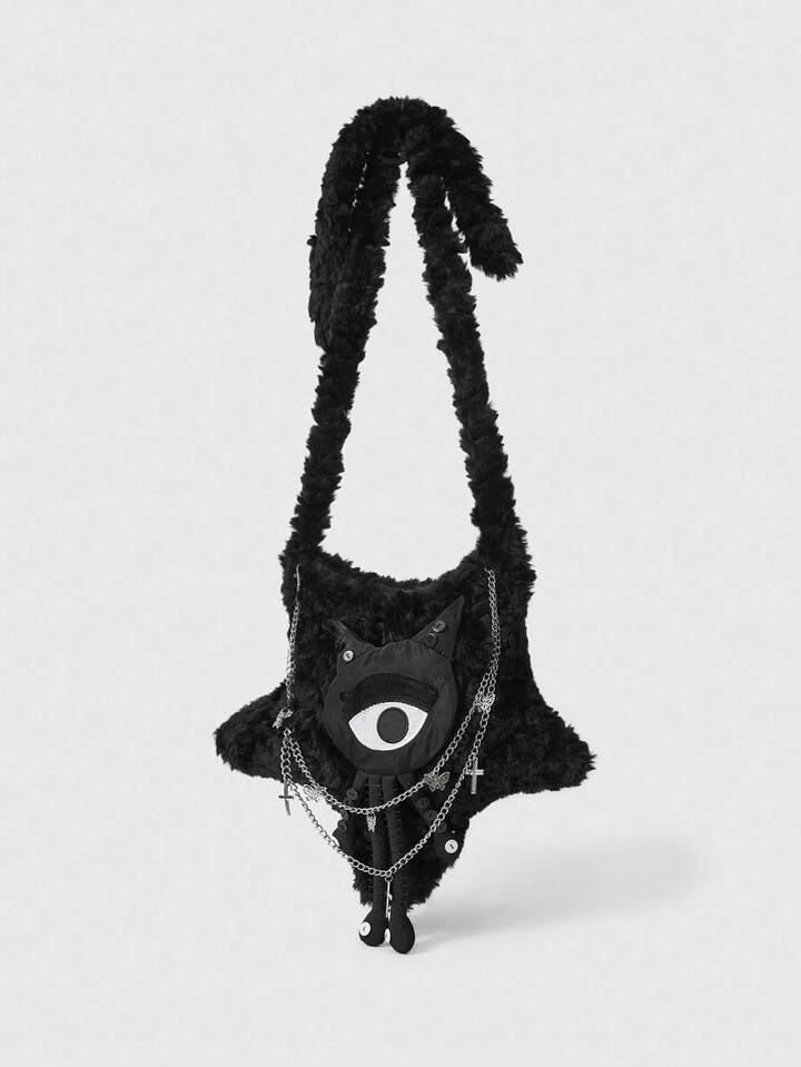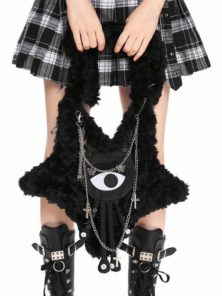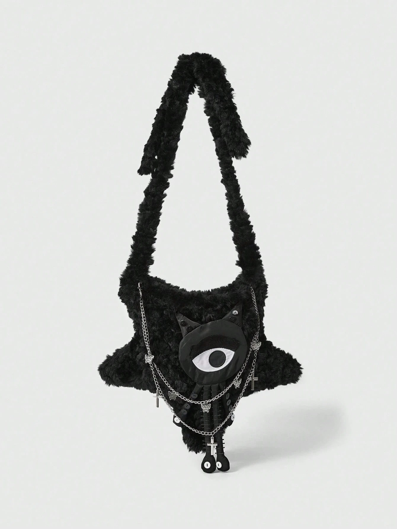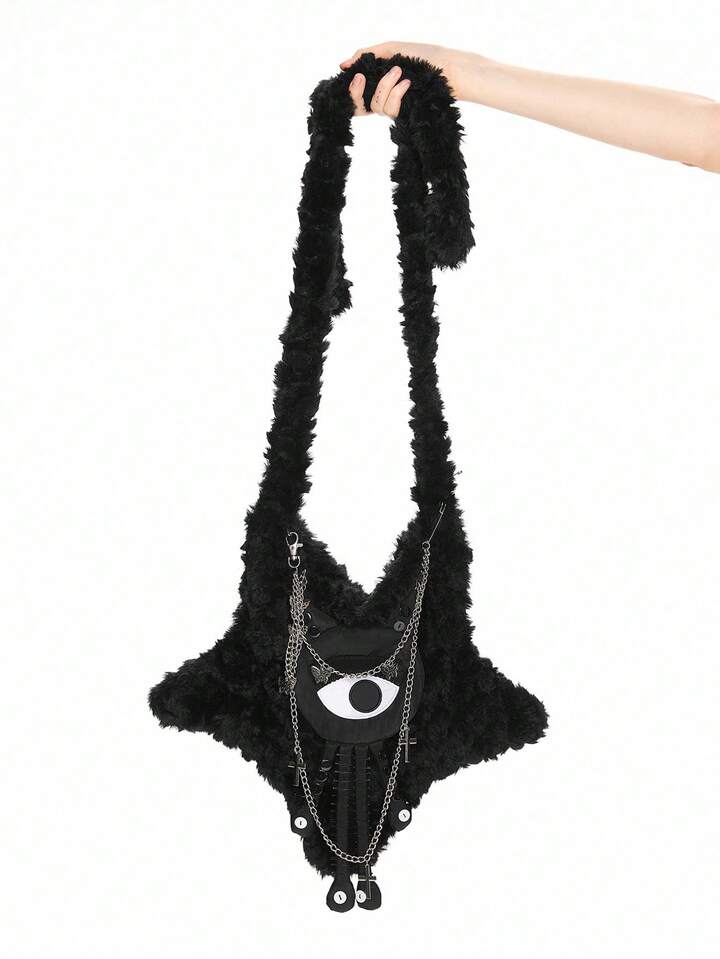 Grunge Punk Halloween Gothic Star Plush Crossbody Bag With Cross Chain And Cyclops Pattern, Y2K Punk Style Fuzzy Shoulder Bag For Women, Autumn/Winter, Halloween Bags Perfect For Fancy Party Matching With Halloween Costumes , Goth