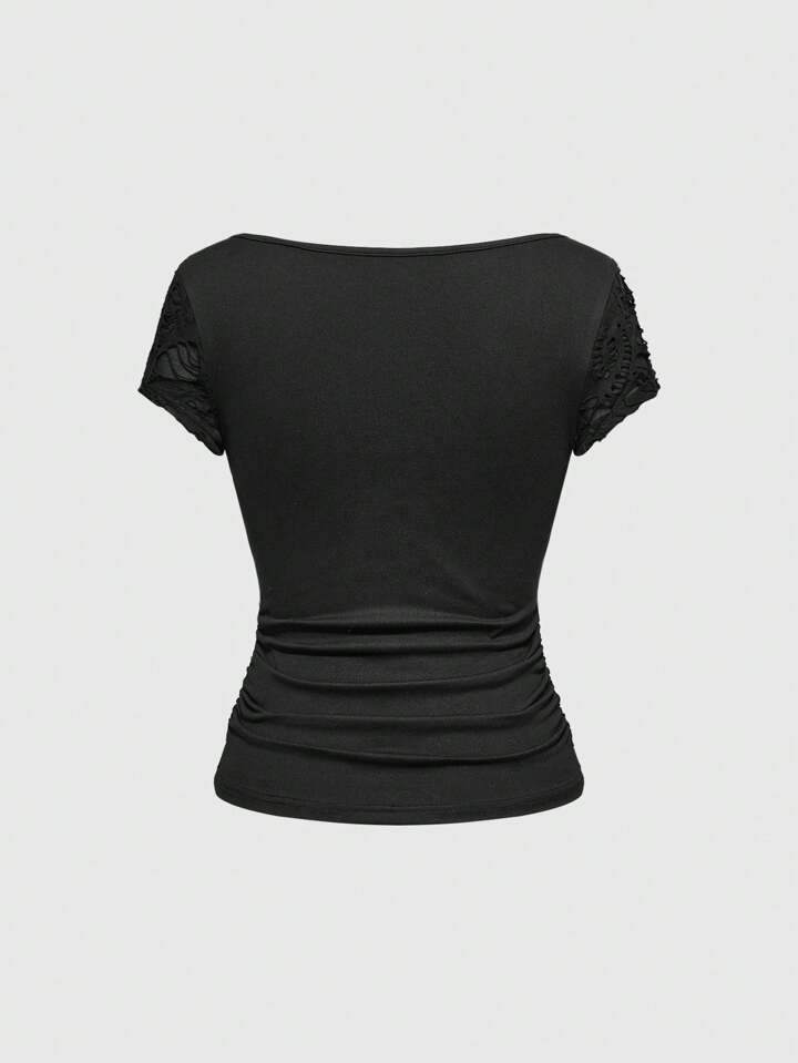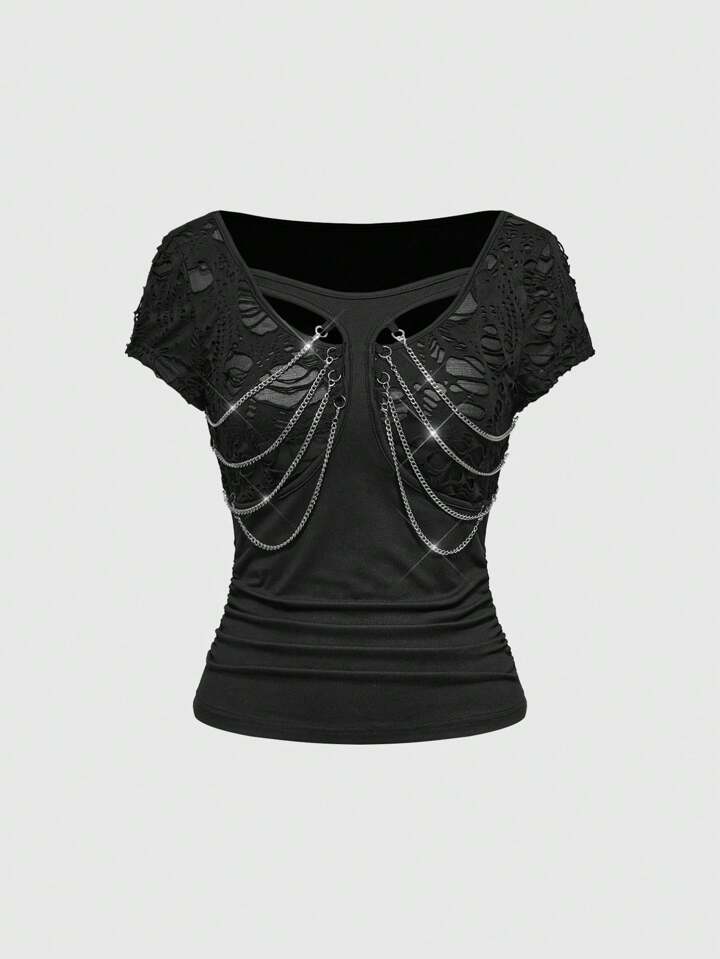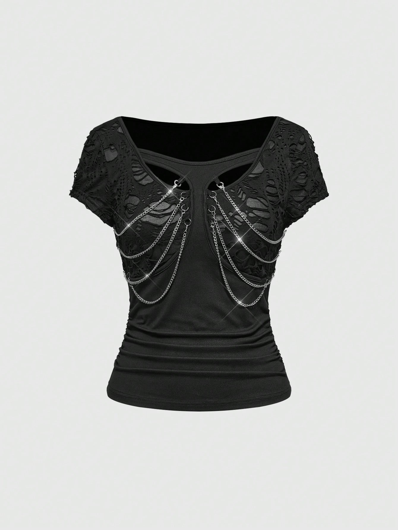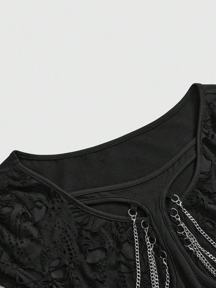 Grunge Punk Halloween T-Shirt Black Punk-Style Chain & Pleated Design Women T-Shirt