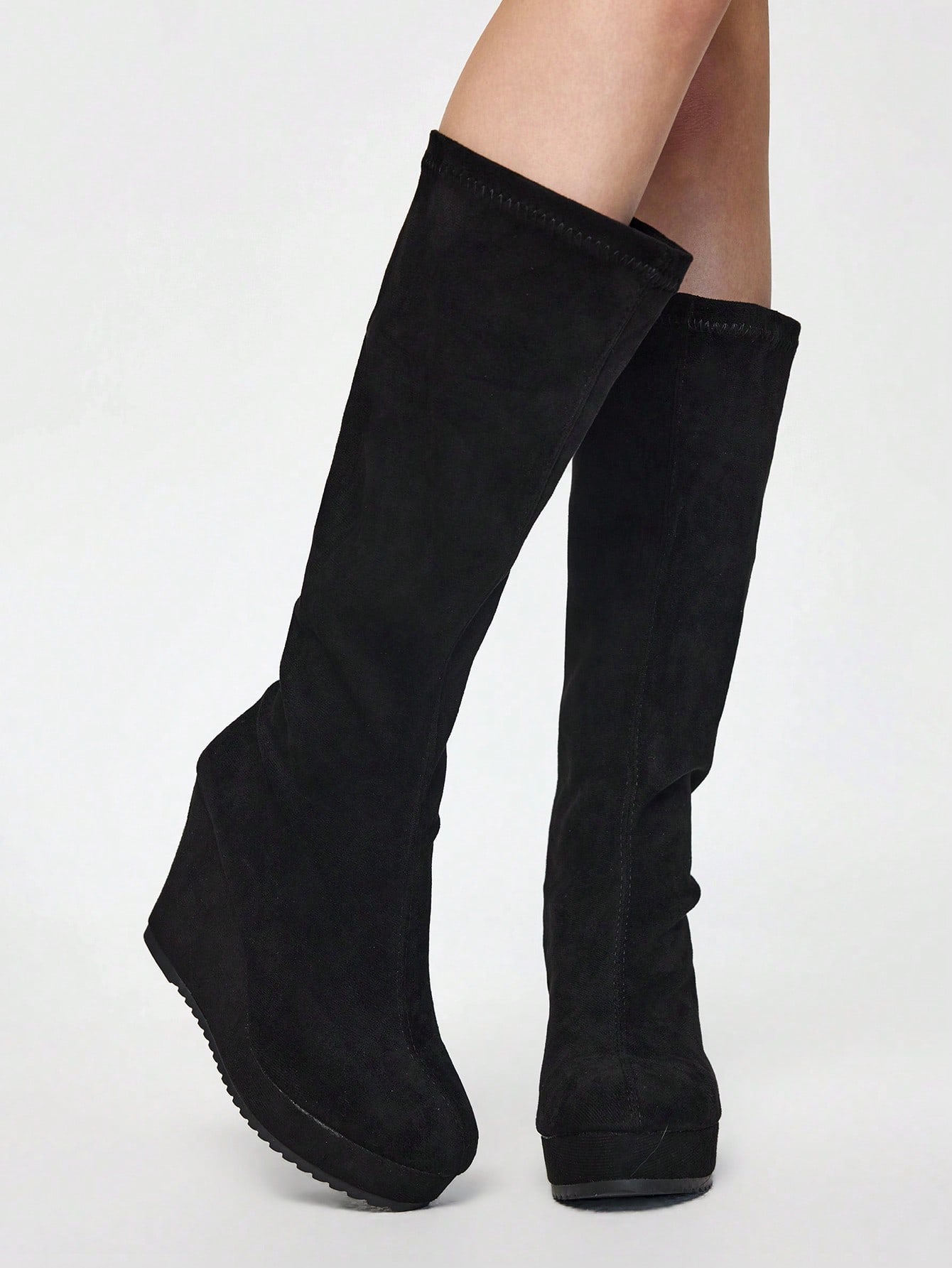 Grunge Punk High Heel Solid Color Elastic Thigh-High Boots For Women, New Slim Fit Over-The-Knee Boots With Thick Platform Wedges, European And American Fashion Tall Boots, Versatile Style